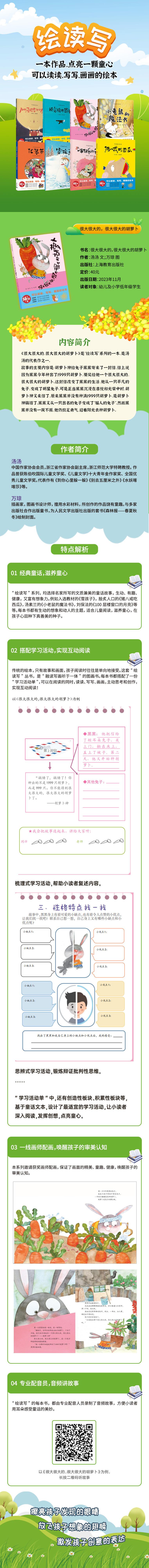 """Zanahorias Grandes, Grandes, Grandes" es una de las obras representativas de Tang Tang. El contenido principal de la historia es: El Dios Zanahoria envió una carta a la coneja Heihei, diciendo que debido a que Heihei plantó 1999 zanahorias este año, la recompensaría con una zanahoria muy grande, muy grande. Esta carta cambió la vida de Heihei. Pasó de ser una coneja ordinaria a una coneja estrella. Pero justo cuando Heihei estaba inmersa en la alegría y la gloria, el Dios Zanahoria envió otra carta. Resultó que Heihei no plantó 1999 zanahorias. El Dios Zanahoria cometió un error. Heihei pasó de ser una coneja famosa a una coneja engañosa, una coneja hipócrita. Sin embargo, Heihei no se desanimó. Todavía reunió el coraje para plantar zanahorias bajo el sol."""