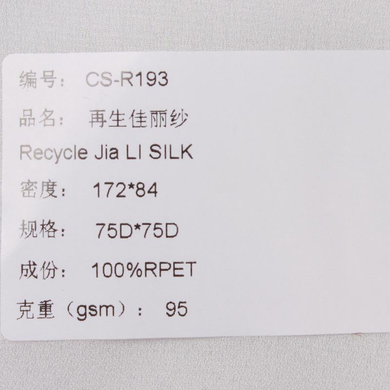 CS-R127 | Hilado de nailon reciclado de 260T | CS-R179 | Sarga 3/3 de alta elasticidad T400 reciclada | CS-R058 | Cuentas de gasa auténticas recicladas de 75D, 28 vueltas | CS-R215 | Tejido liso catiónico 300D reciclado |