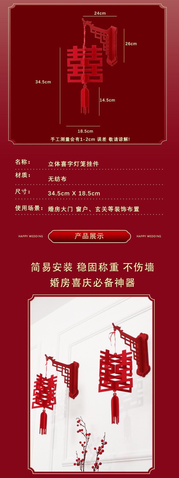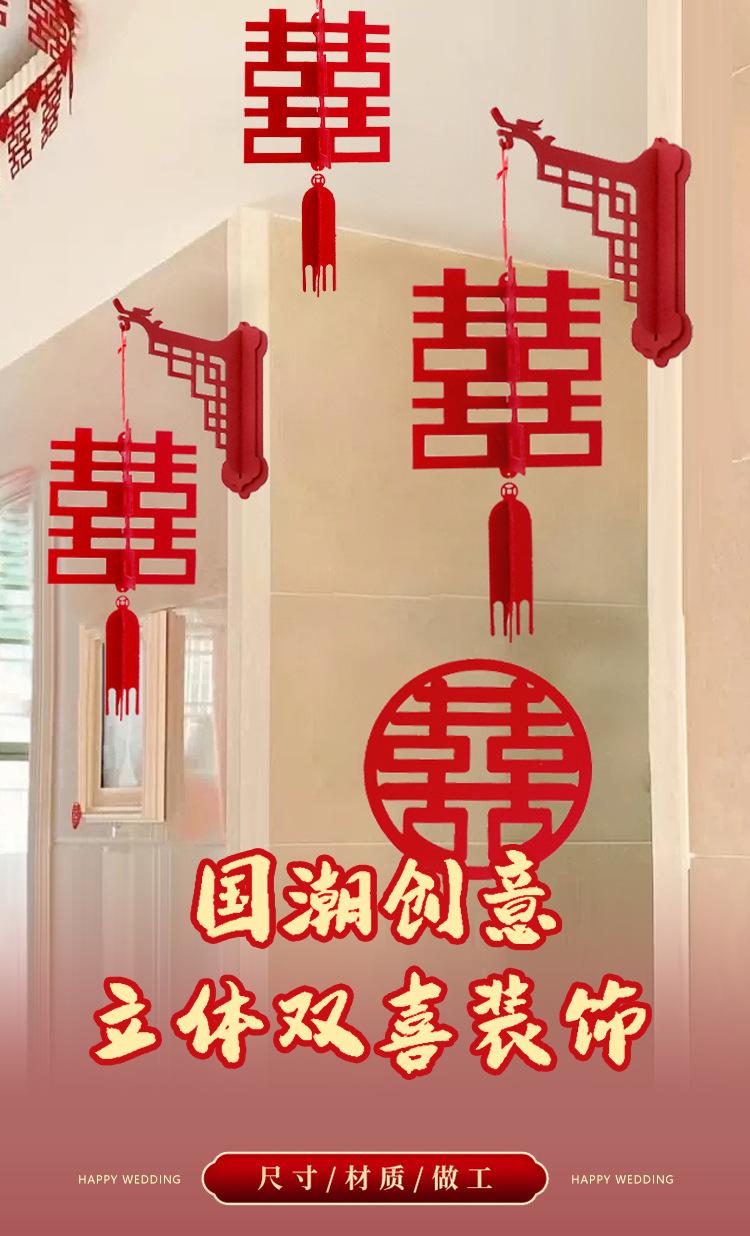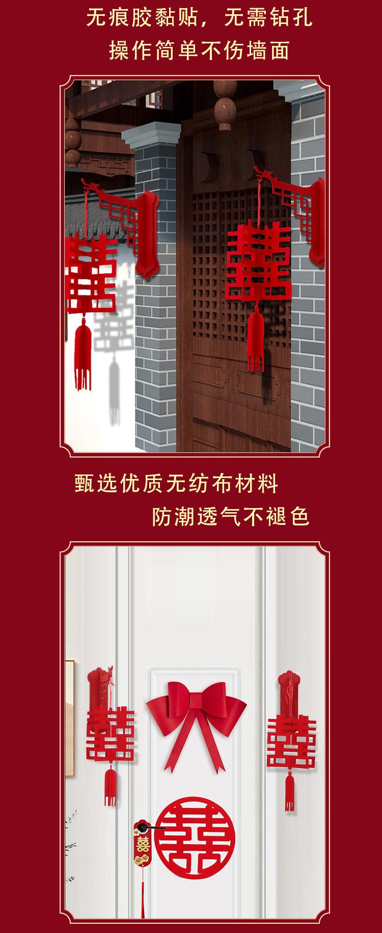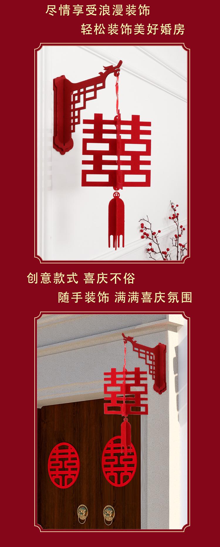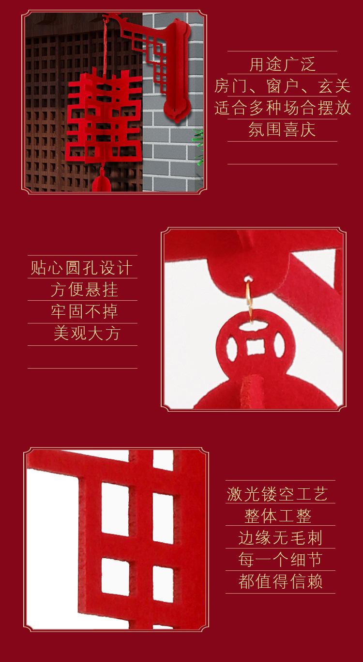 Descripción del producto: El colgante adhesivo personalizado para puerta "Doble Felicidad" no tejido no solo tiene un acabado exquisito, sino que también tiene un estilo novedoso que realza la textura del producto. El envío se realiza en plano. Tras recibir el producto, simplemente puede ensamblarlo y decorarlo.