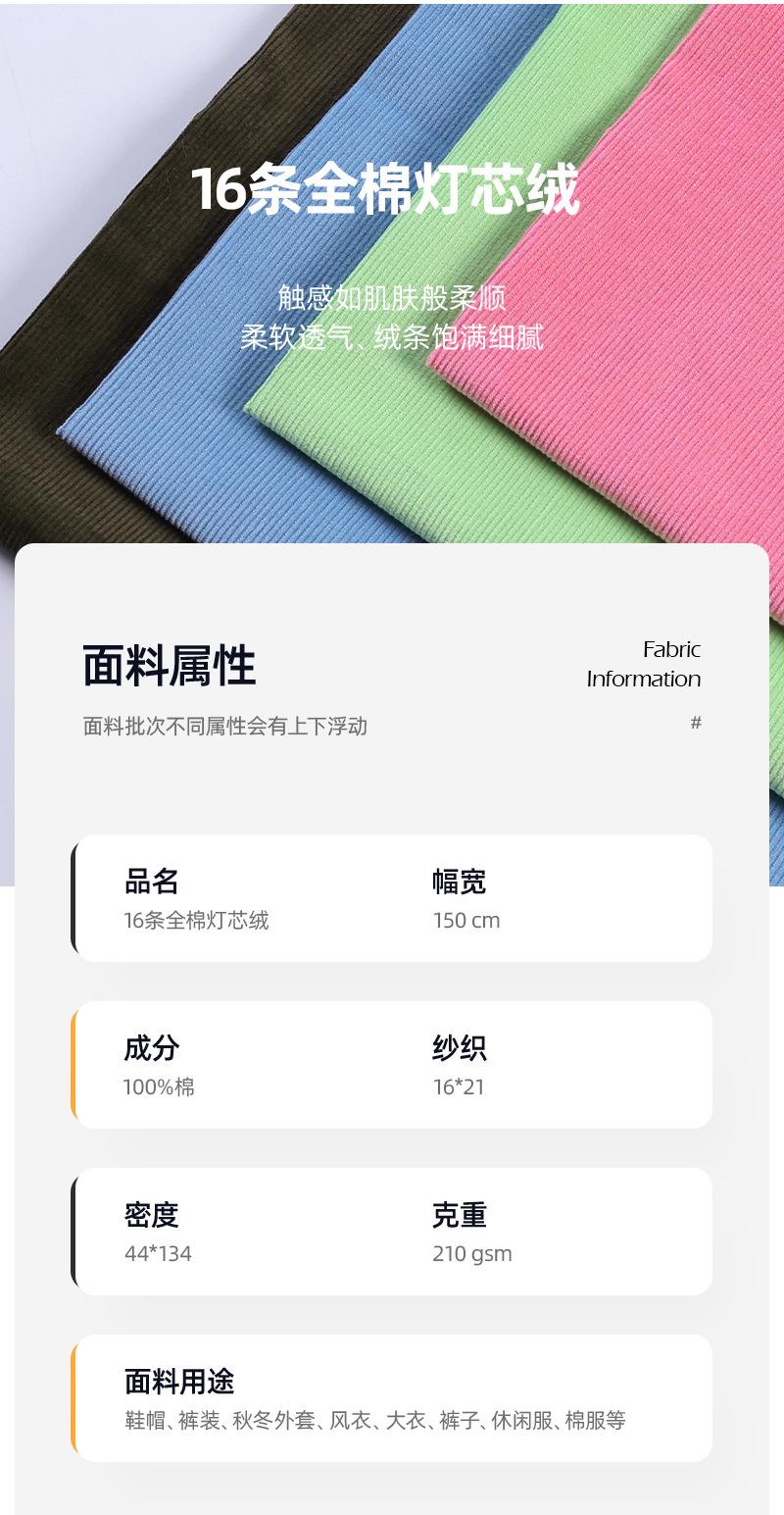 Suministro directo de fábrica de 16 telas finas de pana de algodón de 210 g para zapatos, sombreros, bolsos, telas textiles de moda para el hogar.