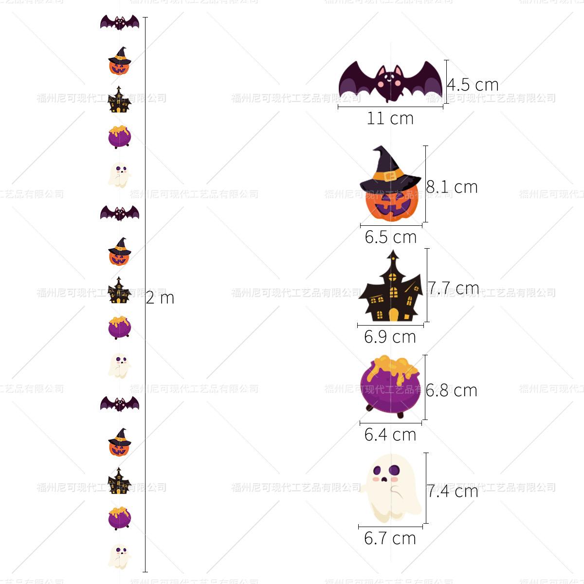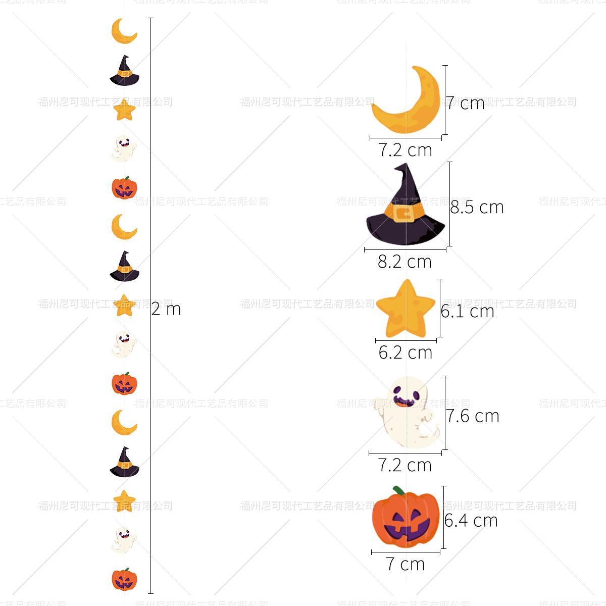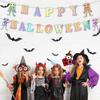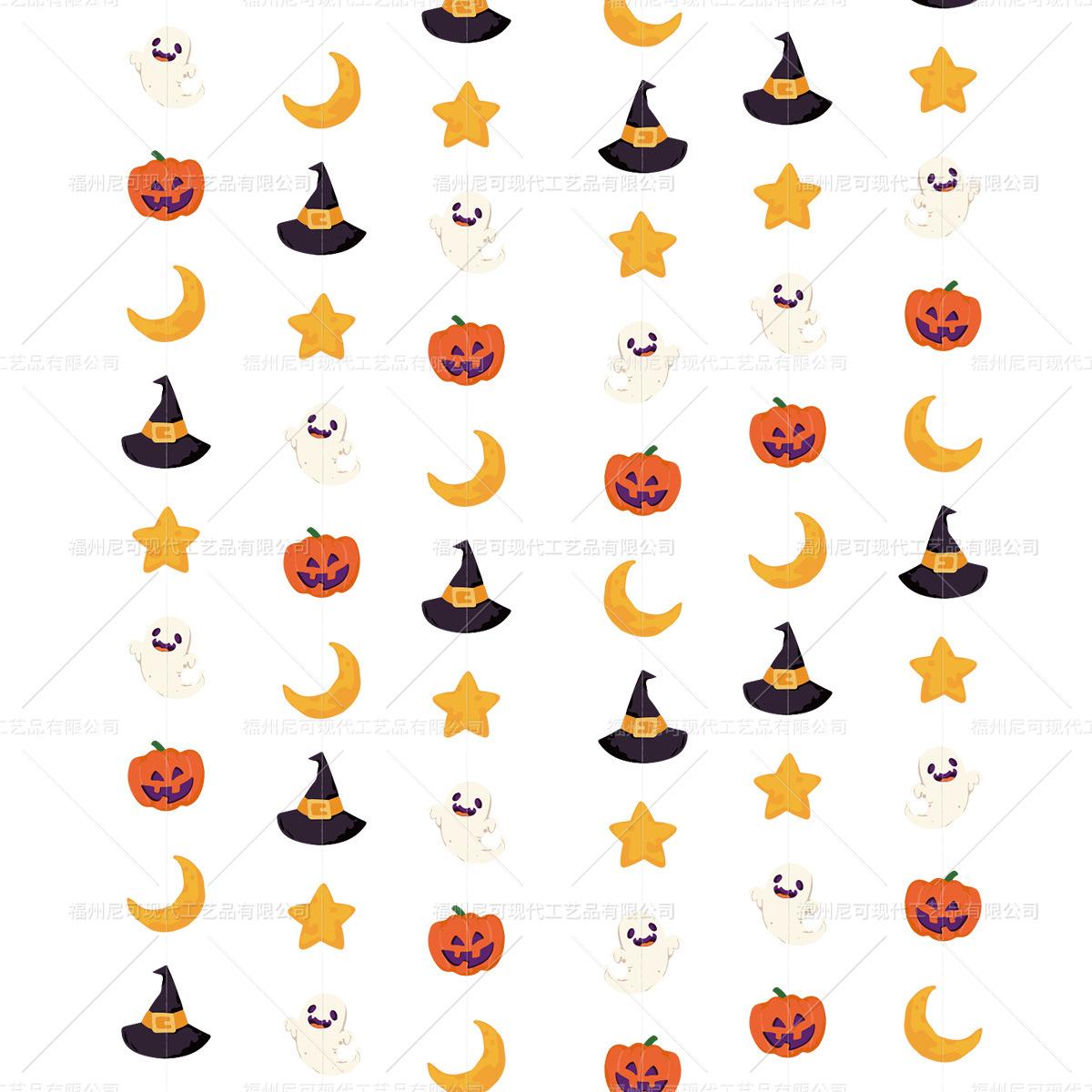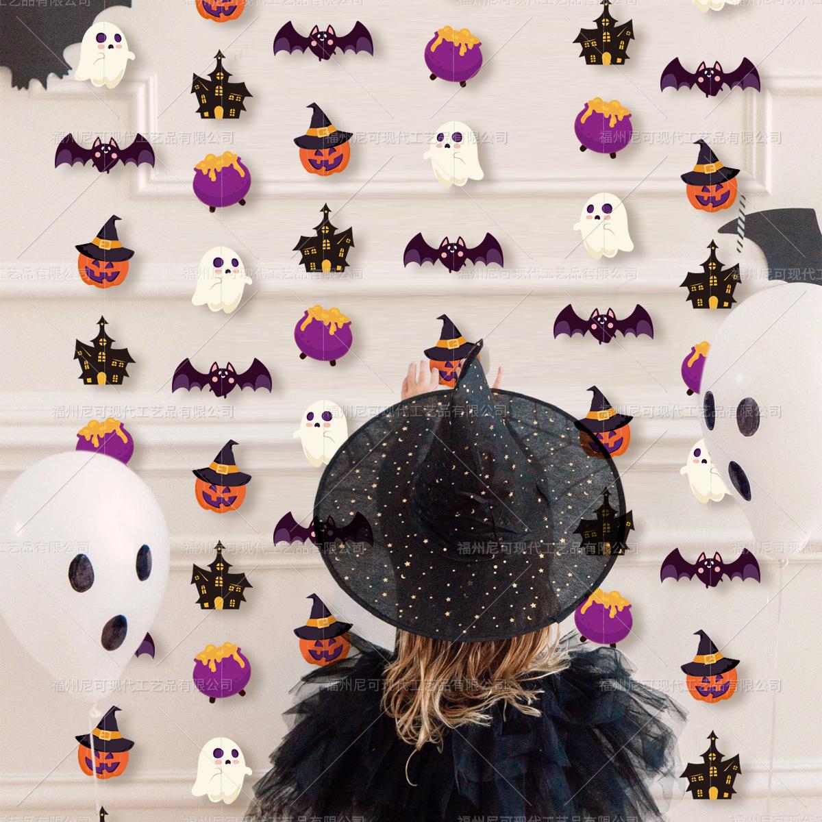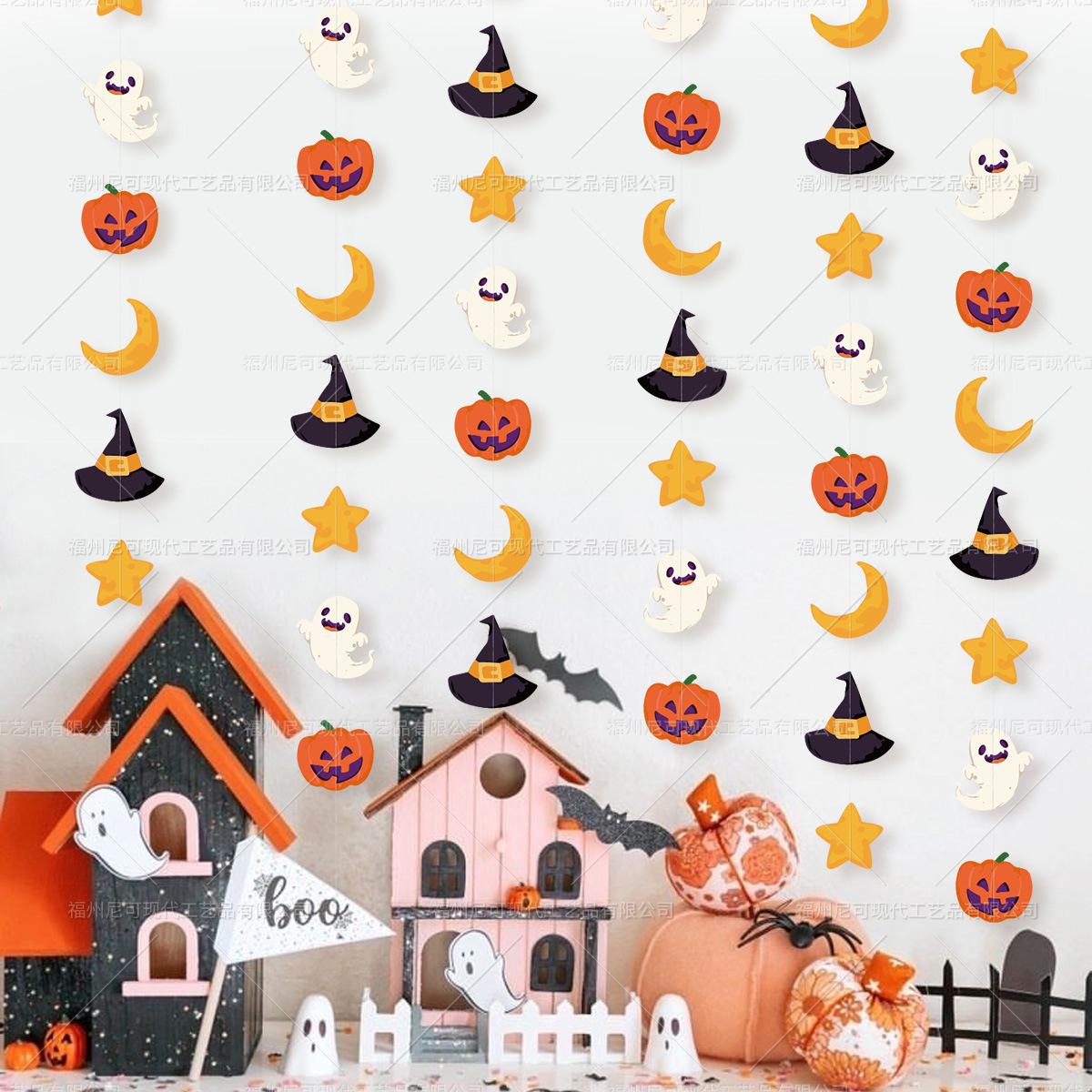 Decoración de ambiente para fiesta temática de Halloween con cuerdas de papel y flores, adornos colgantes con forma de bandera y cuerdas de papel.