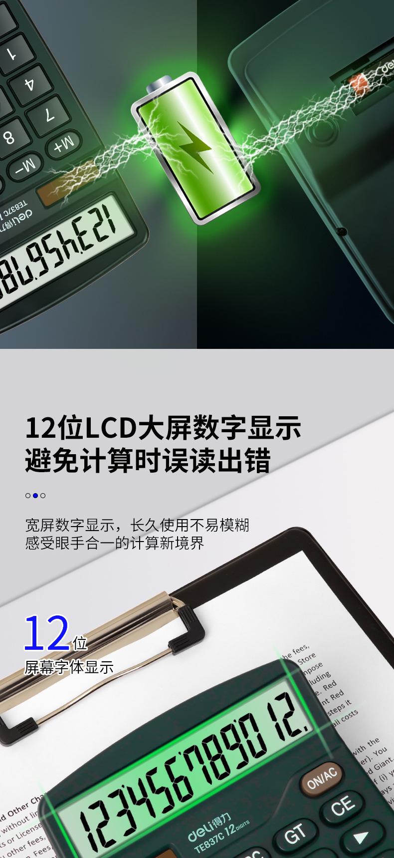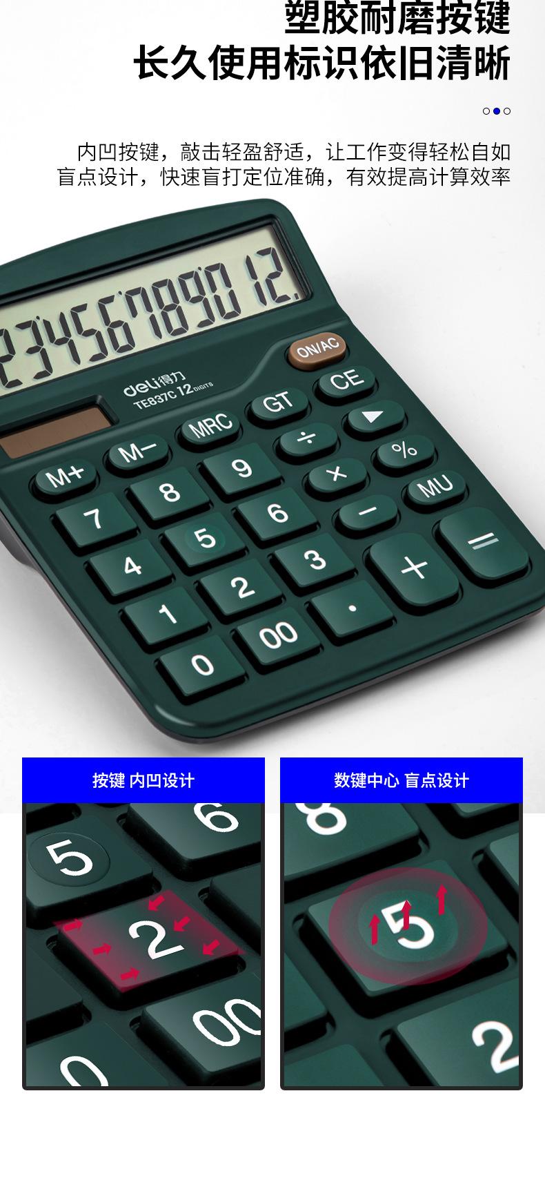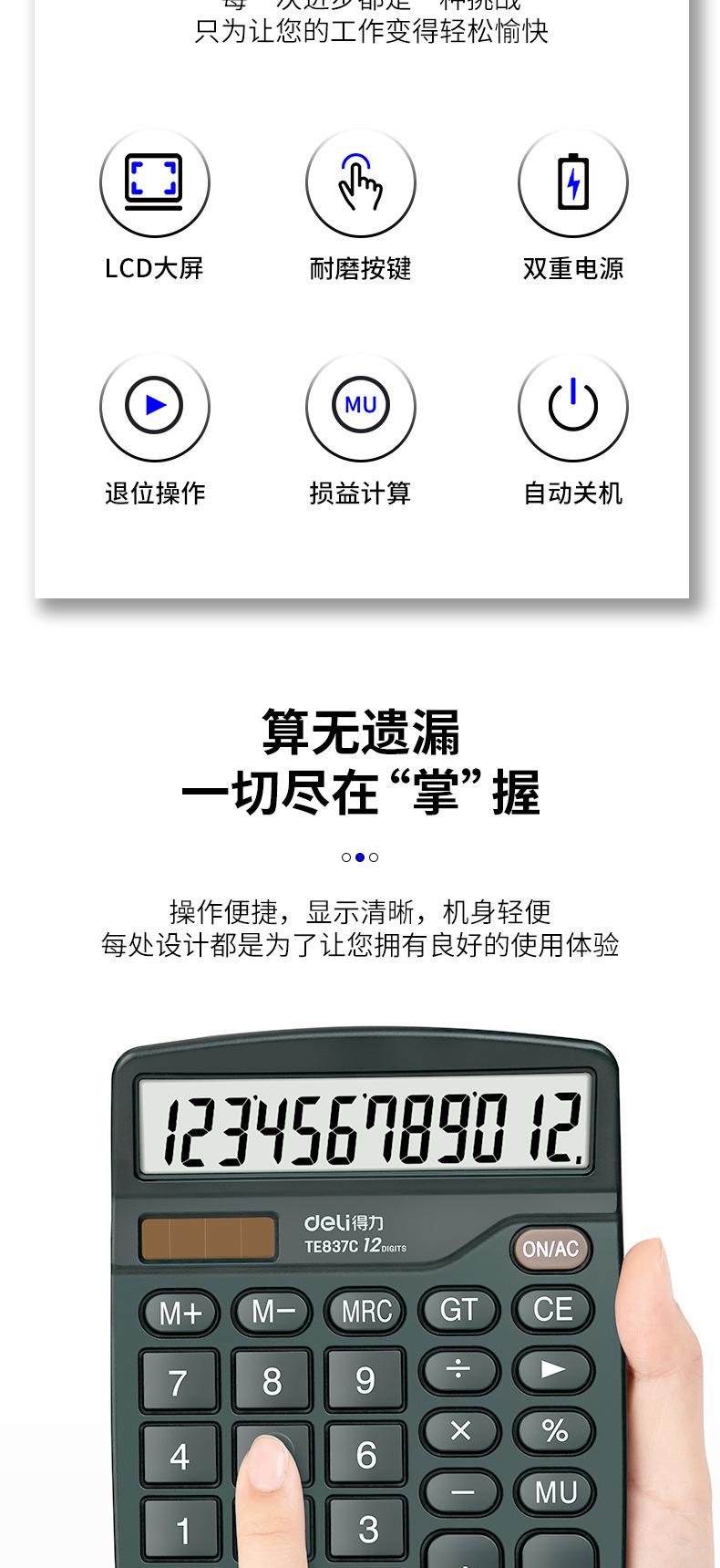 Calculadora financiera de oficina solar de doble potencia con pantalla digital grande de 12 dígitos Deli TE837C para estudiantes
