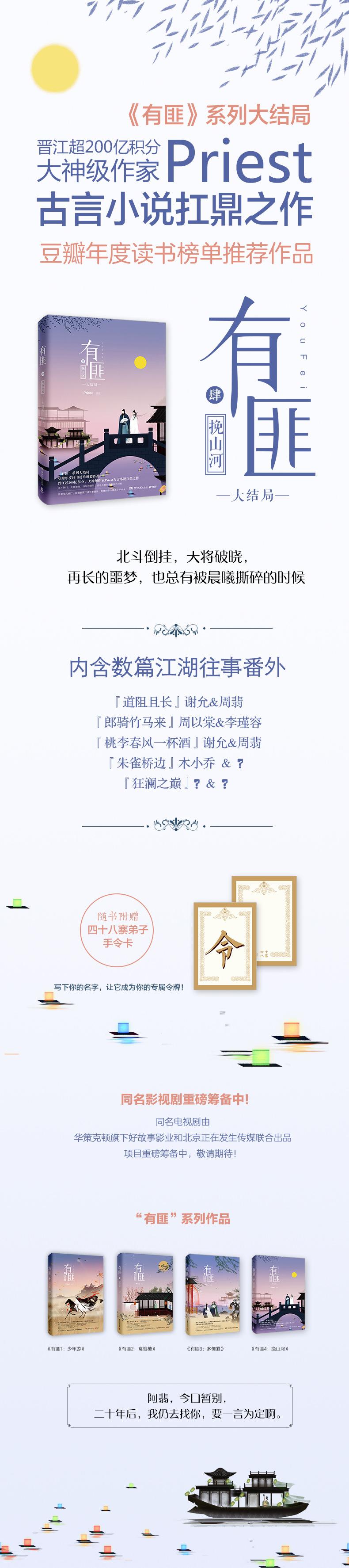 Obras recomendadas de la lista anual de lecturas de Douban: ¡el final de la serie "You Fei"! ¡La obra maestra de la novela china antigua del gran escritor Priest, con más de 20 mil millones de puntos Jinjiang! Obras recomendadas de la lista anual de lecturas de Douban: ¡el final de la serie "You Fei"! La Osa Mayor está al revés y el cielo está a punto de amanecer. No importa cuán larga sea la pesadilla, ¡la luz del amanecer siempre la desgarrará! Se añaden varios capítulos nuevos del pasado de Jianghu, ¡y se adjunta una tarjeta de pedido para los discípulos de las Cuarenta y Ocho Aldeas! Se acerca la ceremonia de culto a los antepasados, y muchas fuerzas están en camino, y las bridas apuntan al mismo lugar: la capital sureña, Jinling. ¿Cuánto tiempo podrá mantenerse estable esta pacífica ciudad de Jinling? ◆ ¡Lista anual de lecturas de Douban 2016! ¡El elogiado final de la serie "You Fei"! ◆ Clasificada entre las diez mejores en la lista semestral del ranking de novelas en línea de China de 2016 y ganó el premio especial del Comité de Literatura de la Red de la Asociación de Escritores de China.