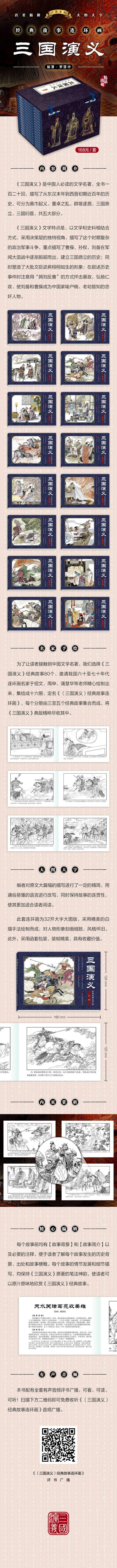 El Romance de los Tres Reinos es una obra maestra literaria recomendada por el pueblo chino. El libro tiene 120 capítulos y describe la historia de casi 100 años desde el final de la dinastía Han Oriental hasta principios de la dinastía Jin Occidental. Se puede dividir en cinco partes: la Rebelión de los Turbantes Amarillos, la Rebelión de Dong Zhuo, los Estados en Guerra, los Tres Reinos y los Tres Reinos volviendo a la dinastía Jin. Las características literarias del Romance de los Tres Reinos son que combina literatura y materiales históricos y adopta la perspectiva única del nivel de toma de decisiones para describir las complejas luchas políticas y militares de este período. Se centra en la historia de cómo Cao Cao, Sun Quan y Liu Bei emergieron gradualmente de los señores de la guerra y establecieron los Tres Reinos; al mismo tiempo, crea una gran cantidad de imágenes vívidas de funcionarios civiles y generales militares; al narrar los acontecimientos históricos, presta atención al uso del método de "apoyar a Liu y oponerse a Cao" para criticar la tiranía y promover el gobierno benevolente, haciendo de Liu Bei y Cao Cao figuras leales y traidoras bien conocidas en China, jóvenes y viejos.