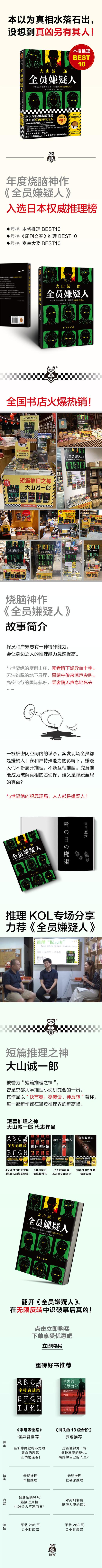 [Japón] Oyama Seiichiro es conocido como el "Dios de los Relatos Cortos" y fue miembro de la Sociedad de Investigación de Ficción de Misterio de la Universidad de Kioto. Debutó en 2004 con "El Caso Misterioso del Alfabeto" y fue muy elogiado en el mundo del misterio por su lógica sofisticada y trascendente. Al año siguiente, fue incluido en la lista BEST10 de misterio ortodoxo. Desde entonces, ha publicado sucesivamente "El Coleccionista de la Habitación Secreta", "Coartada Absoluta" y "El Museo de los Trucos", arrasando repetidamente en las tres principales listas japonesas de misterio y ganando numerosos premios de misterio de prestigio. "Todos los Sospechosos" es una nueva colección de relatos de misterio de Oyama Seiichiro, centrada en múltiples reveses. Este libro narra siete casos en torno al "modo isla" del género de misterio. Debido a que el protagonista tiene una habilidad especial para mejorar la capacidad de razonamiento de los demás, además del asesino, la identidad del detective se ha convertido en uno de los misterios, lo que hace que todos los casos sean cada vez más confusos. Las obras de Oyama Seiichiro se caracterizan por "un ritmo rápido, cero tonterías, cambios mágicos, etc."
