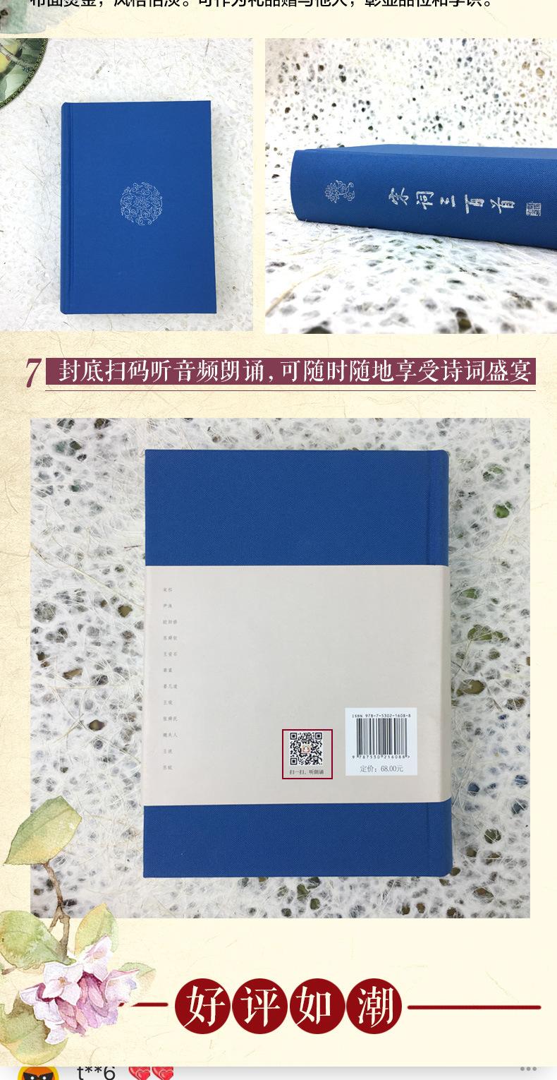 "Trescientos Poemas Song" contiene 321 poemas de 134 autores, obras excelentes, auténticas, amables y hermosas, ampliamente difundidas a lo largo de la historia. Entre ellos, destacan Su Shi, Xin Qiji y muchos otros autores famosos, además de autores menores. Incluso se incluyen autores anónimos cuyas obras se han transmitido de generación en generación. Los poetas seleccionados y sus obras representativas reflejan plenamente la riqueza y diversidad de temas, modos, escuelas y estilos de la poesía Song, mostrando el estilo general de la poesía Song. Además, la clasificación según el año de nacimiento de los autores permite apreciar la trayectoria de desarrollo y evolución de la poesía Song.
