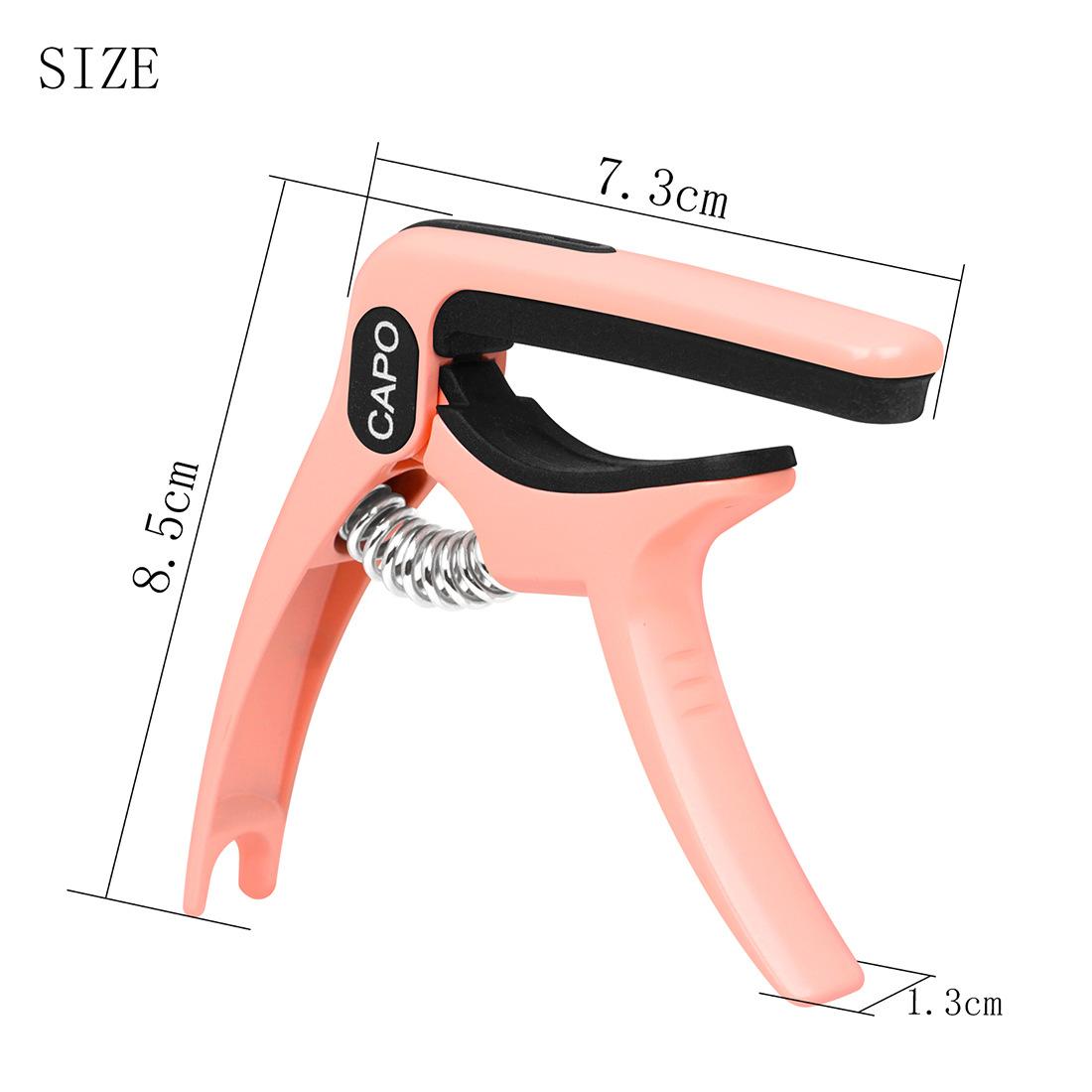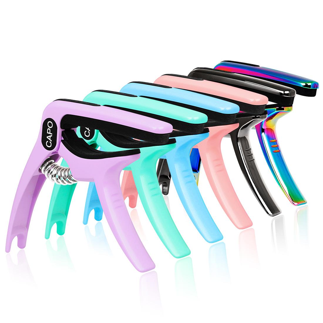 Punto de uso/venta: Hecho de cuerpo de metal, alta dureza, duradero y resistente al desgaste, con ranura de almacenamiento para púas incorporada y quitaúñas incorporado en el extremo posterior. Seis colores disponibles, cuatro colores macarrón, dos colores metálicos de alto valor niquelados, diseño simple y hermoso. La pinza capo tiene un gel suave de alta densidad, que puede presionar las cuerdas firmemente sin dañar el cuerpo de la guitarra, y el resorte de alta elasticidad puede presionar las cuerdas firmemente.