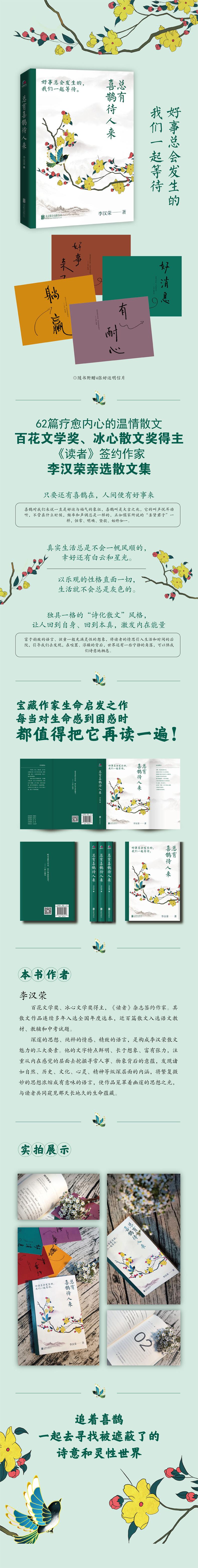 1. La urraca siempre ha sido un símbolo de buena suerte y bendición para nosotros. El canto de la urraca es un buen presagio. Su canto es agradable a los oídos. No importa cuándo, la frecuencia y el tono son siempre los mismos, como los "sabios y caballeros" mencionados por el confucianismo, constantes, claros, resueltos y consistentes. 2. La vida real no siempre es un camino de rosas, pero afortunadamente hay nubes blancas y luz de estrellas. Enfrenta todo con un carácter optimista, y la vida no siempre será gris. 3. Todas las dificultades y cosas insatisfactorias son solo temporales. Mientras haya urracas volando cerca, las cosas buenas seguramente llegarán. ¡Esperemos juntos! 4. 62 cálidos ensayos que curan el corazón, con un estilo único de "ensayo poético", que permiten a las personas regresar a sí mismas, volver a su verdadero ser y estimular la energía interior. Ganador del Premio Literario Cien Flores y del Premio de Ensayo Bing Xin, firmado por "Reader", etc.