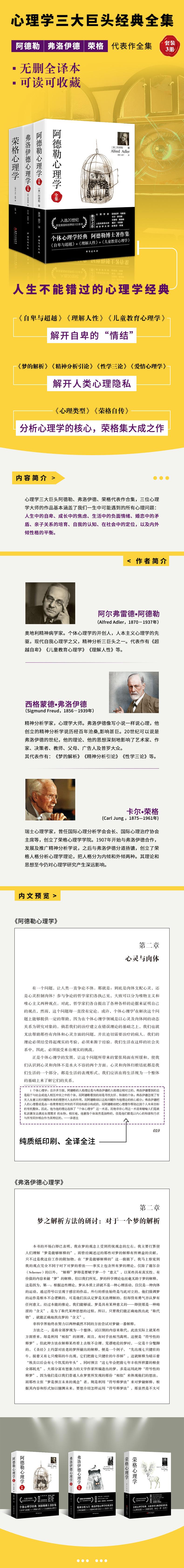 "Psicología Adleriana" es una colección de obras representativas clásicas del Dr. Adler, un pionero de la psicología individual, incluyendo "Comprender la naturaleza humana" y "Psicología de la educación infantil". Es un conjunto de libros de psicología popular que abarcan la educación infantil, la salud mental, la perspectiva humana y la inspiración espiritual, ayudándole a desarrollar mejor su potencial, comprender a los demás y ampliar el patrón de vida. "Inferioridad y trascendencia" es un libro de psicología popular que explica el camino y el significado de la vida. Es una lectura obligada para aquellos que están ansiosos por superar la inferioridad y lograr el doble éxito en la vida y la carrera; "Comprender la naturaleza humana" intenta ayudar a las personas comunes a comprenderse correctamente a sí mismas y a las personas que les rodean, manejar mejor las relaciones cotidianas, abrazar el mundo en el que vivimos y reducir los errores en el comportamiento vital. "Psicología de la educación infantil" señala que la personalidad se forma en la infancia. Para resolver los problemas de personalidad y psicológicos de una persona, hay que empezar por su infancia. El Dr. Adler utilizará casos para cultivar correctamente la independencia, la autoconfianza, el coraje, el miedo a las dificultades y la capacidad de cooperar activamente con los demás y con el colectivo en los niños. "Las Obras Completas de la Psicología de Freud" es una colección de las obras clásicas de Freud, incluyendo "La Interpretación de los Sueños", "Introducción al Psicoanálisis" y "Tres Ensayos sobre la Sexualidad". "La Interpretación de los Sueños" es una obra fundamental del psicoanálisis y una de las tres mayores obras de la revolución del pensamiento humano.