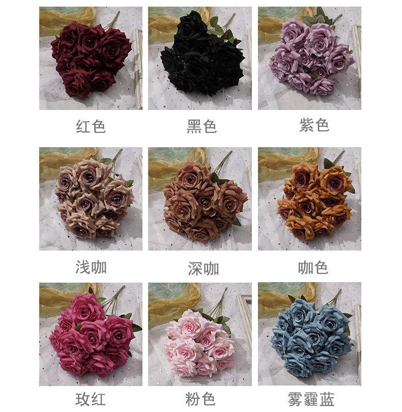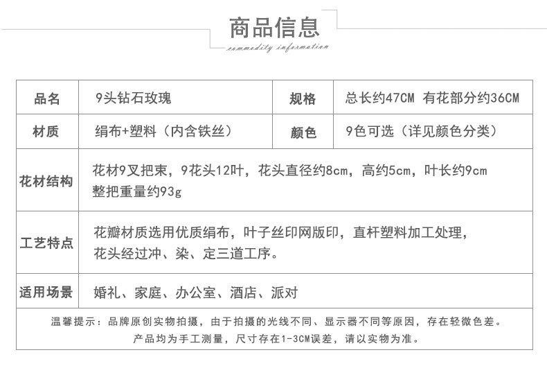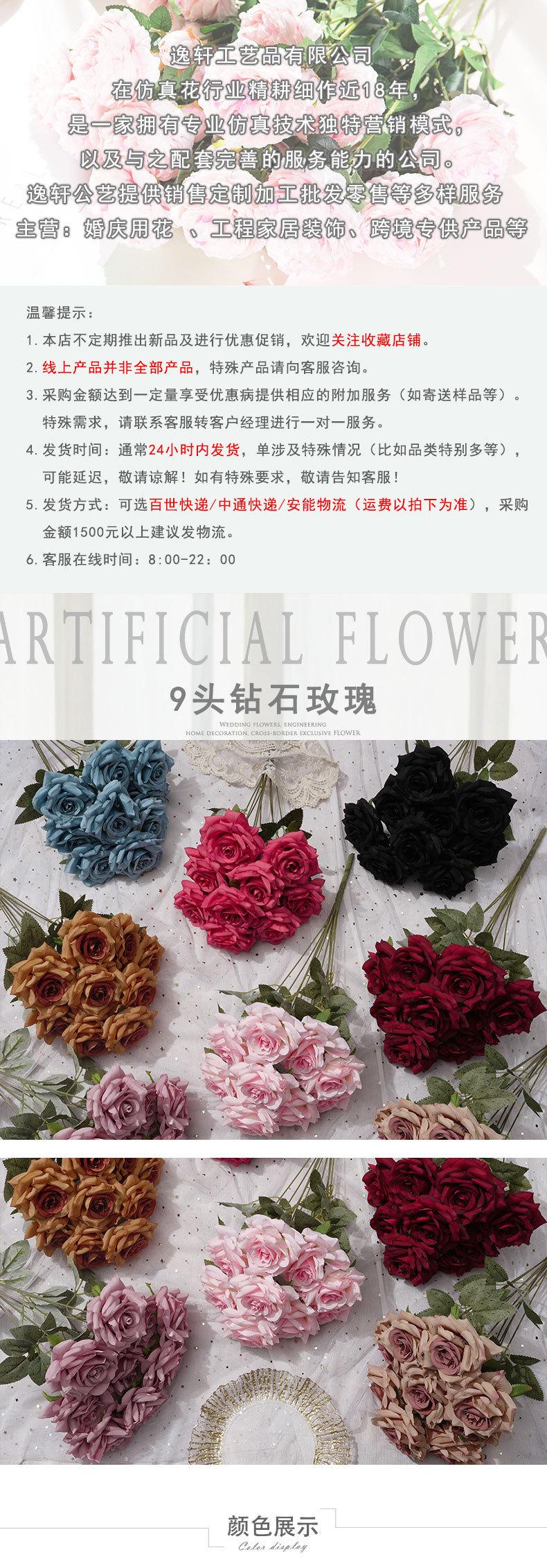 Ramo Falso de Rosa Diamante de 9 Cabezas Simuladas Flor de Seda Artificial Acabada Arreglo para Piso de Boda Flor de Plástico Arreglo para Boda