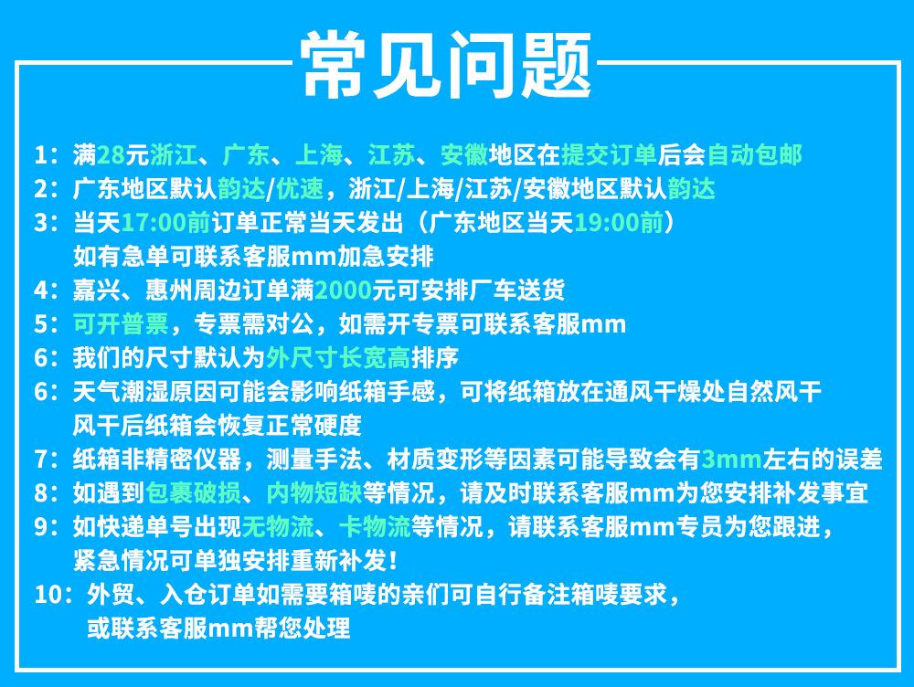 4: Debido a que 1~2 cajas se aplastan y dañan fácilmente durante el transporte, no enviaremos si pide 1~2.La cantidad mínima de pedido para cajas pequeñas de la misma especificación es 3, cajas grandes con especificaciones mínimas de 5 para entrega, ¡por favor entienda!