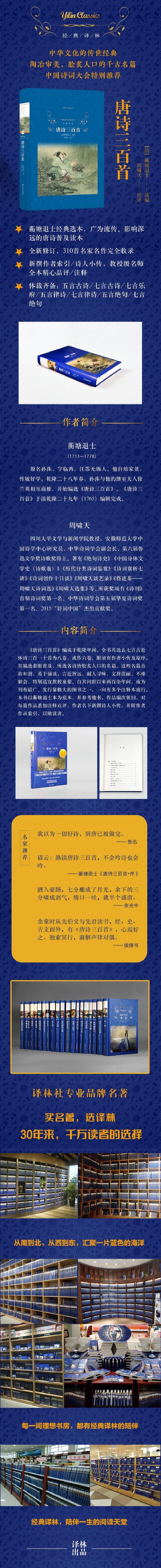 Los "Trescientos Poemas Tang" fue compilado durante el período Qianlong. El editor original fue Sun Zhu, también conocido como "Hengtang Tui Shi". El libro seleccionó 310 poemas en estilos antiguos y modernos de cinco y siete caracteres en ocho volúmenes, o seis volúmenes. El apéndice contiene la biografía del autor y el prefacio original. La compilación de "Trescientos Poemas Tang" tiene como objetivo la popularización, y los poemas seleccionados son todos poemas bien conocidos y populares. Estos poemas famosos tienen rimas armoniosas y son fáciles de recitar. Invitan a la reflexión, y las palabras son sencillas pero profundas. Son elegantes y fáciles de entender, y son particularmente adecuados para enseñar a los niños. Desde su publicación hace más de doscientos años, se ha convertido en uno de los libros más ampliamente publicados y distribuidos, y siempre ha habido múltiples versiones anotadas. Este libro se basa en la versión de Hengtang Tui Shi, y hace referencia a otros libros. El orden de las obras permanece igual, y cada obra está anotada y comentada. Se escribe una nueva biografía del poeta bajo el nombre del autor, y se adjunta un índice de las obras del autor para los lectores.