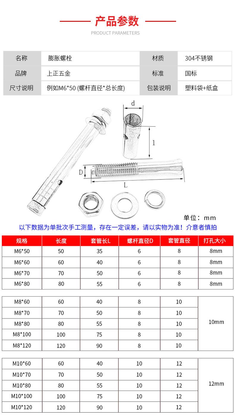 Tornillo de expansión de acero inoxidable 304, venta al por mayor, perno de expansión de expansión extendida M6M8M10M12M16M20