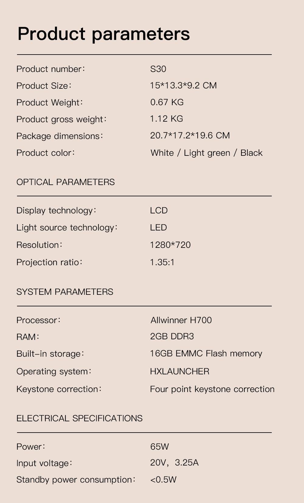 Proyector doméstico HD inalámbrico proyección de teléfono móvil proyector de oficina 720P proyector de cine en casa S30Max