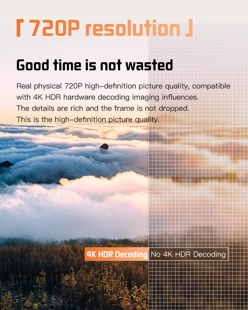 Con la popularidad de la proyección, la actualización de hardware es inminente, la nueva generaciónH700Proyección con alto rendimientoVPUArriba a4KLa capacidad de decodificación de video brinda una experiencia fluida y suave al reproducir videos de alta velocidad de fotogramas para satisfacer las necesidades de visualización de los usuarios para varias superproducciones de alta definición.HDR10/HDR HLG,HDR2SDR/SDR2HDR, para que la imagen sea clara incluso en condiciones de contraluz o luz fuerte