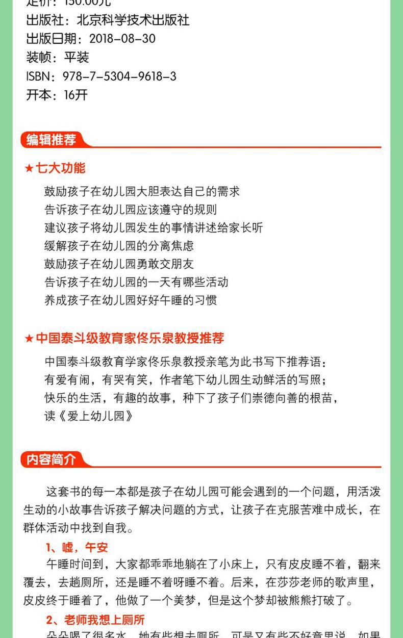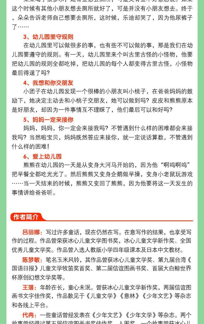 La educación en el jardín de infancia no es de ninguna manera una preparación para la escuela, sino una preparación para la vida futura. Un libro ilustrado de lectura obligada para la admisión al jardín de infancia. Creado conjuntamente por reconocidos escritores de literatura infantil, puede aliviar la ansiedad por separación al ingresar al jardín de infancia, resolver muchos de los problemas que enfrentan los niños en el jardín de infancia y hacer que los niños se enamoren del jardín de infancia. Este conjunto de libros es para todos los niños y padres que esperan con ansias el jardín de infancia pero están nerviosos. ★Siete funciones principales Animar a los niños a expresar con valentía sus necesidades en el jardín de infancia Decirles a los niños las reglas que deben seguir en el jardín de infancia Sugerir a los niños que les cuenten a sus padres lo que sucedió en el jardín de infancia Aliviar la ansiedad por separación de los niños en el jardín de infancia Animar a los niños a hacer amigos con valentía en el jardín de infancia Decirles a los niños qué actividades hay en el jardín de infancia en un día Cultivar el hábito de tomar una buena siesta en el jardín de infancia ★Nivel maestro de chino, etc.