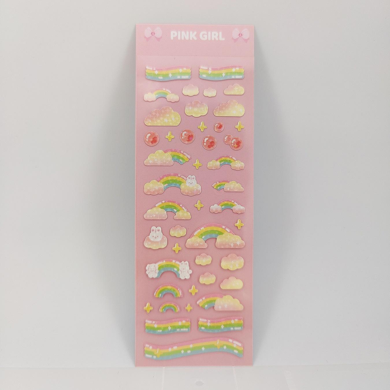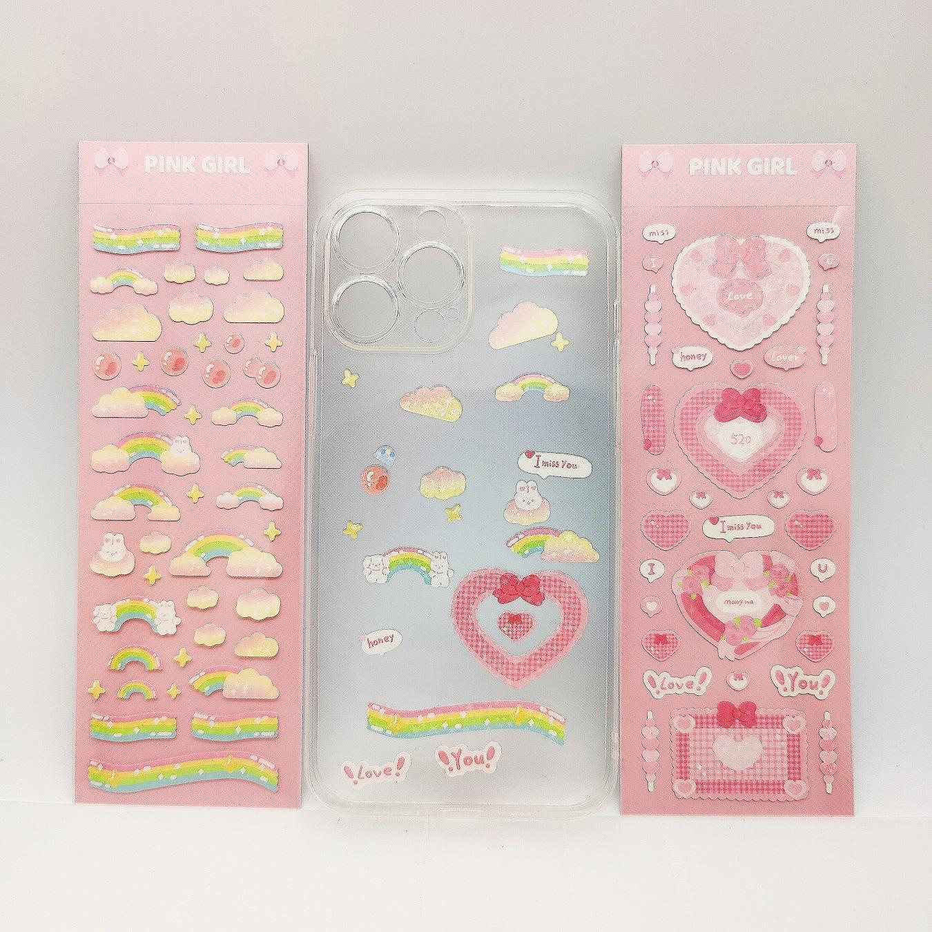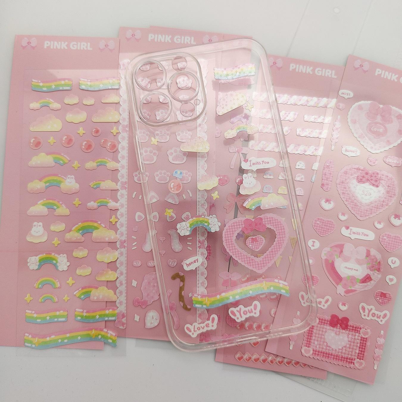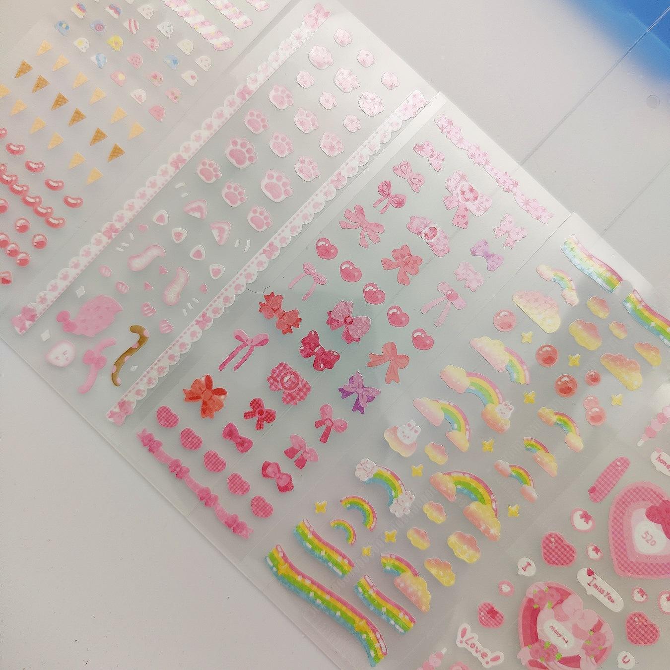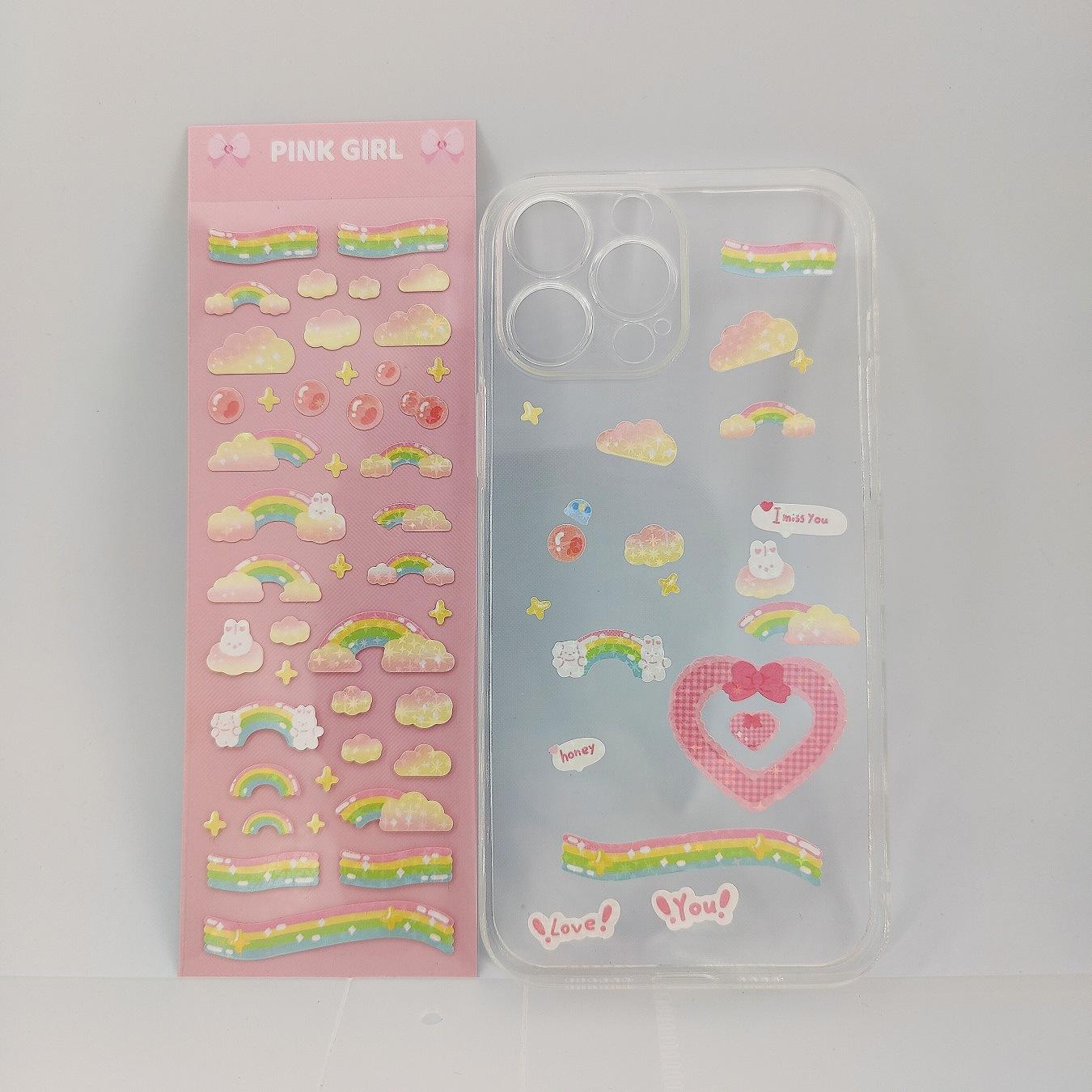 Venta al por mayor de pegatinas de tarjeta de goo con dibujos animados de cuentas de mano coreanas con lazo de arcoíris, lindas pegatinas de tarjeta de goo láser pequeñas