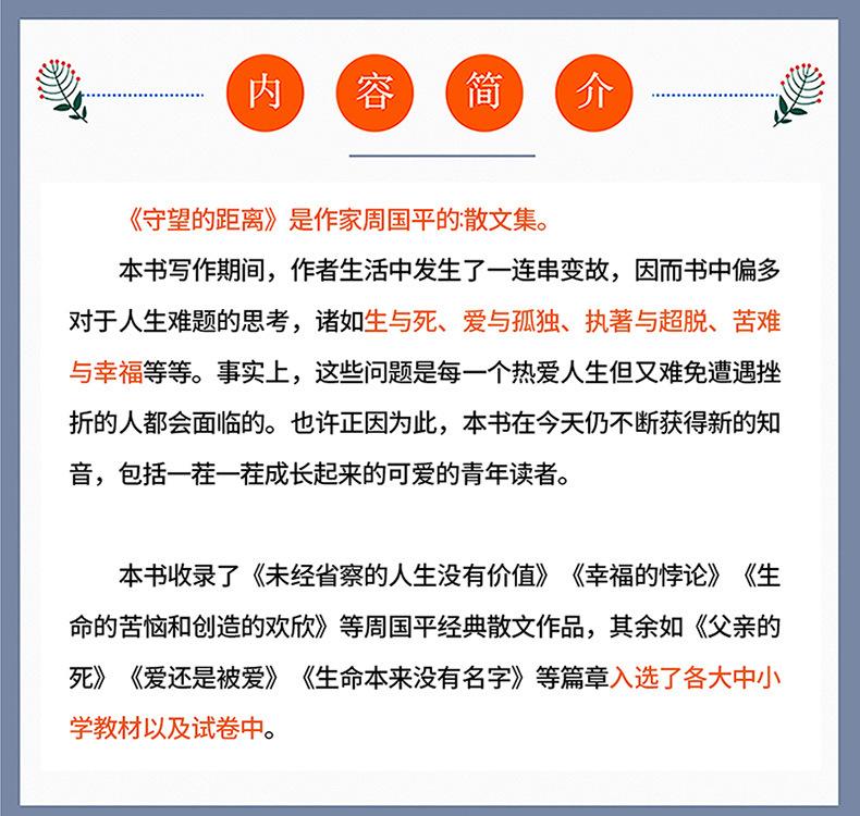 "Distancia de Observación" es la primera colección de ensayos del escritor Zhou Guoping. Durante la escritura de este libro, ocurrieron una serie de cambios en la vida del autor, por lo que el libro se centra en reflexionar sobre problemas de la vida, como la vida y la muerte, el amor y la soledad, la persistencia y el desapego, el sufrimiento y la felicidad, etc. De hecho, estos problemas son enfrentados por todos los que aman la vida pero inevitablemente encuentran contratiempos. Quizás debido a esto, este libro sigue ganando nuevos amigos hoy en día, incluyendo a encantadores jóvenes lectores que han crecido uno tras otro.