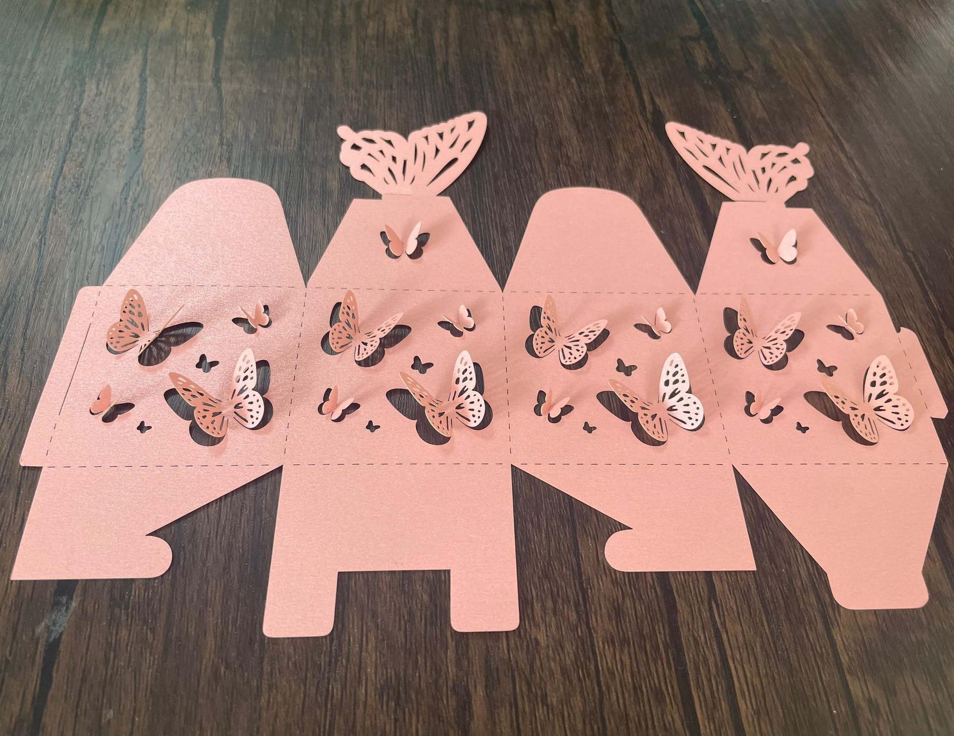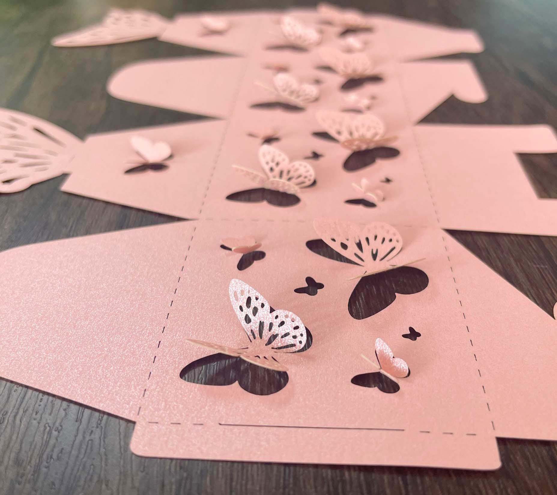 Podemos realizar la personalización de varias flores de papel huecas para regalos de bodas/bordes de pasteles/cajas de dulces de boda huecas con láser/todo tipo de juegos de cajas de papel huecas con láser para embalaje/tarjetas de felicitación huecas/invitaciones huecas/tarjetas de asiento y otros diversos accesorios artesanales relacionados con el láser.