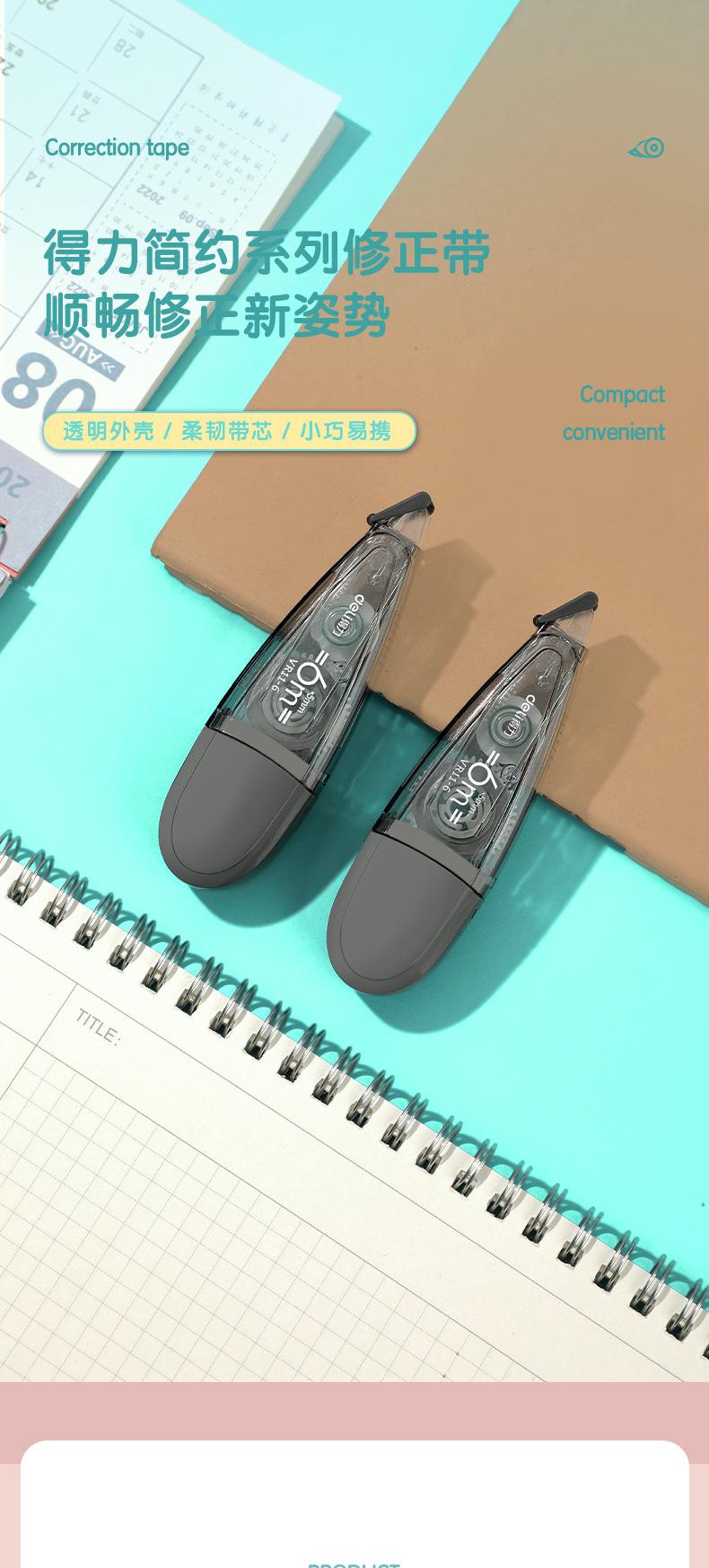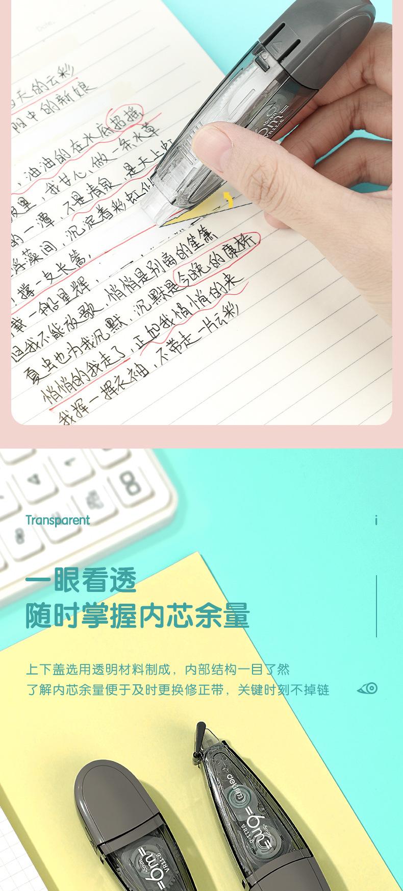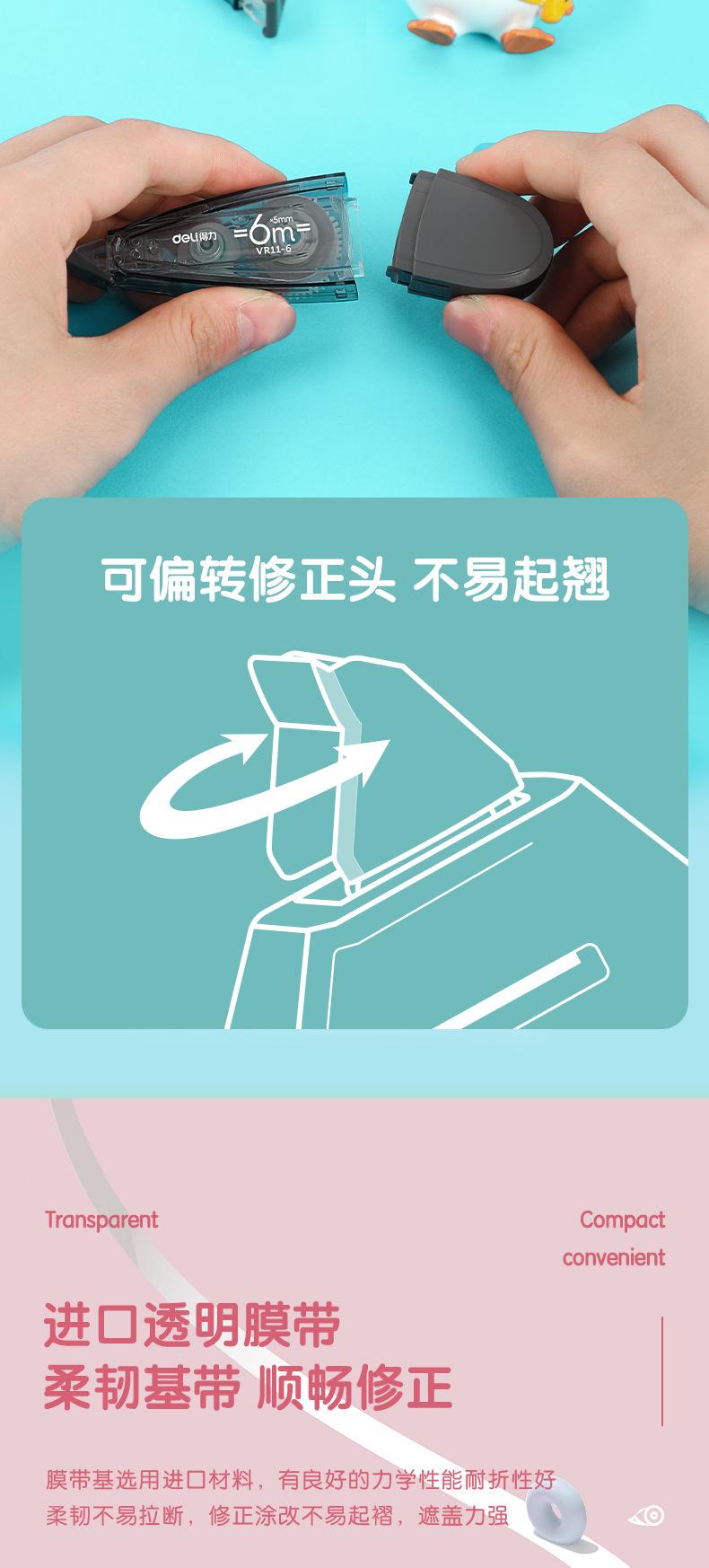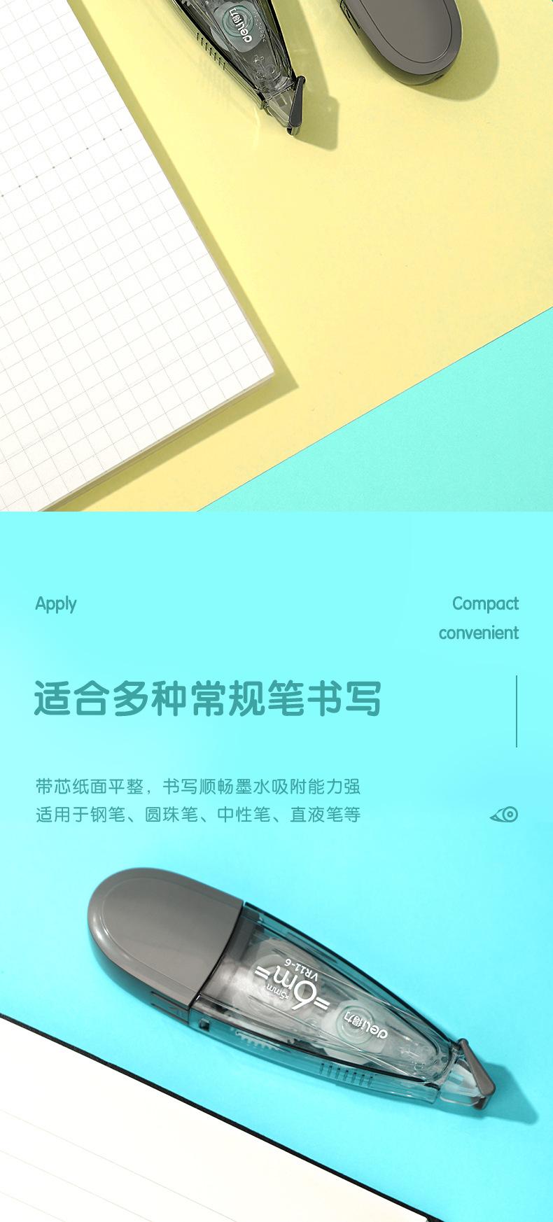 Cinta correctora Deli Deli VR11-6, tipo bolígrafo, 6 m, con núcleo reemplazable para estudiantes de secundaria.