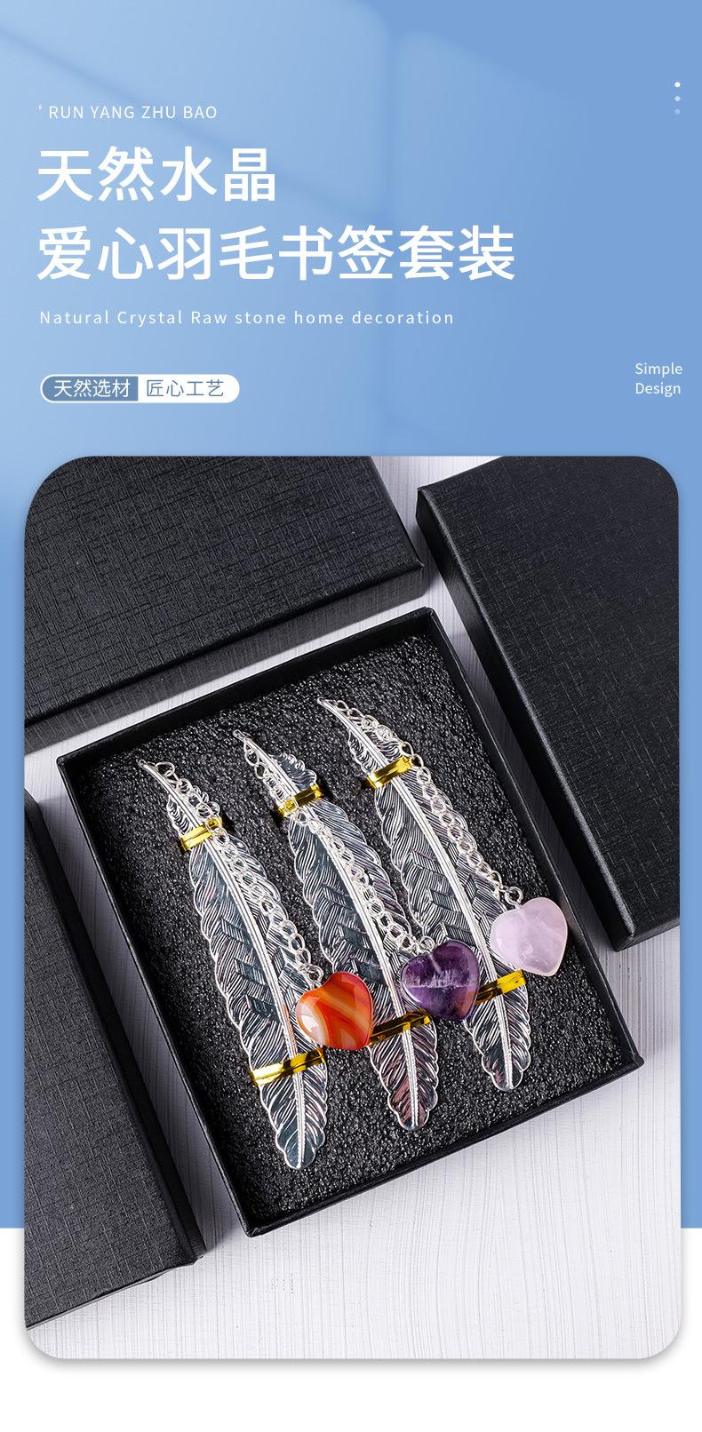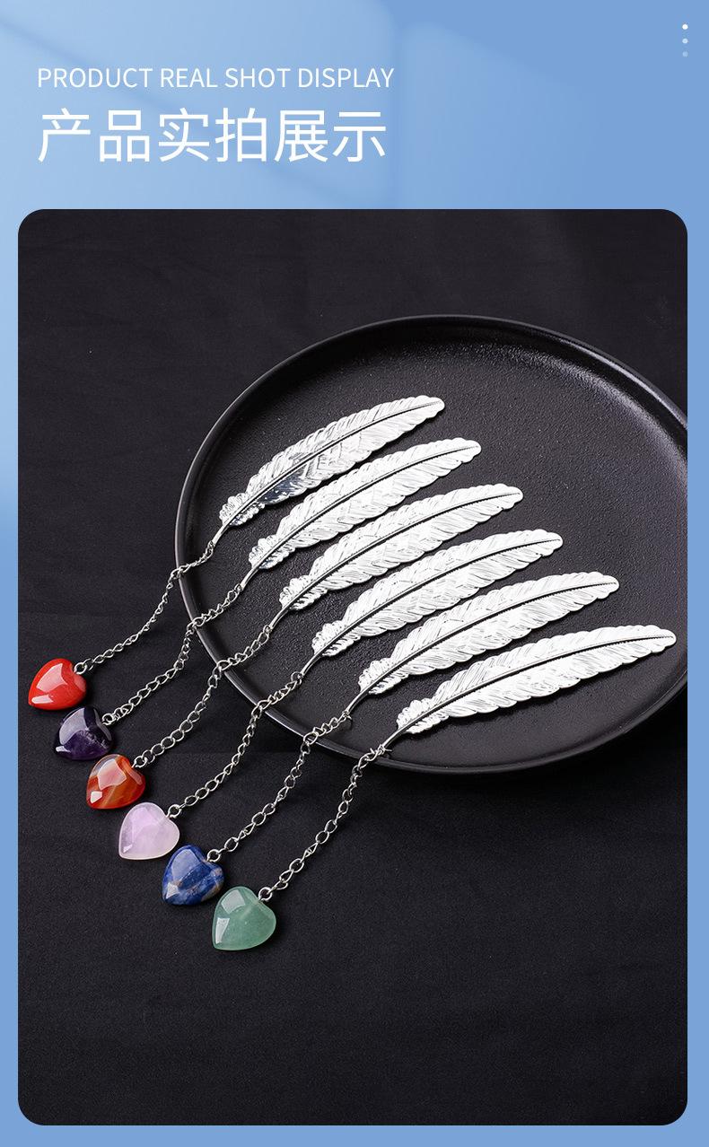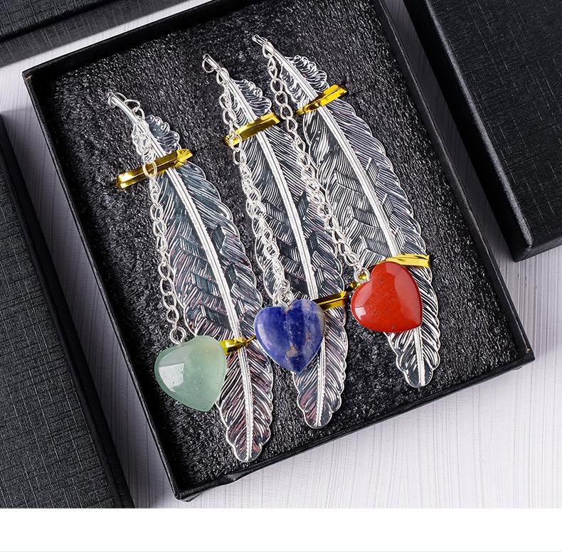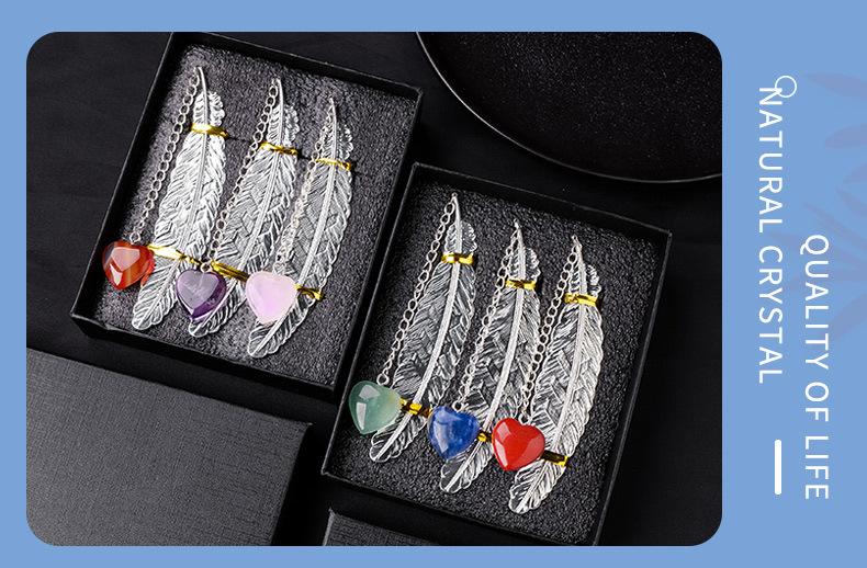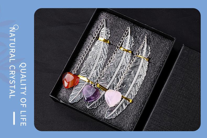 Marcapáginas de plumas de metal con forma de corazón de cristal natural, venta transfronteriza, ideal como regalo creativo para estudiantes, papelería, caja de regalo