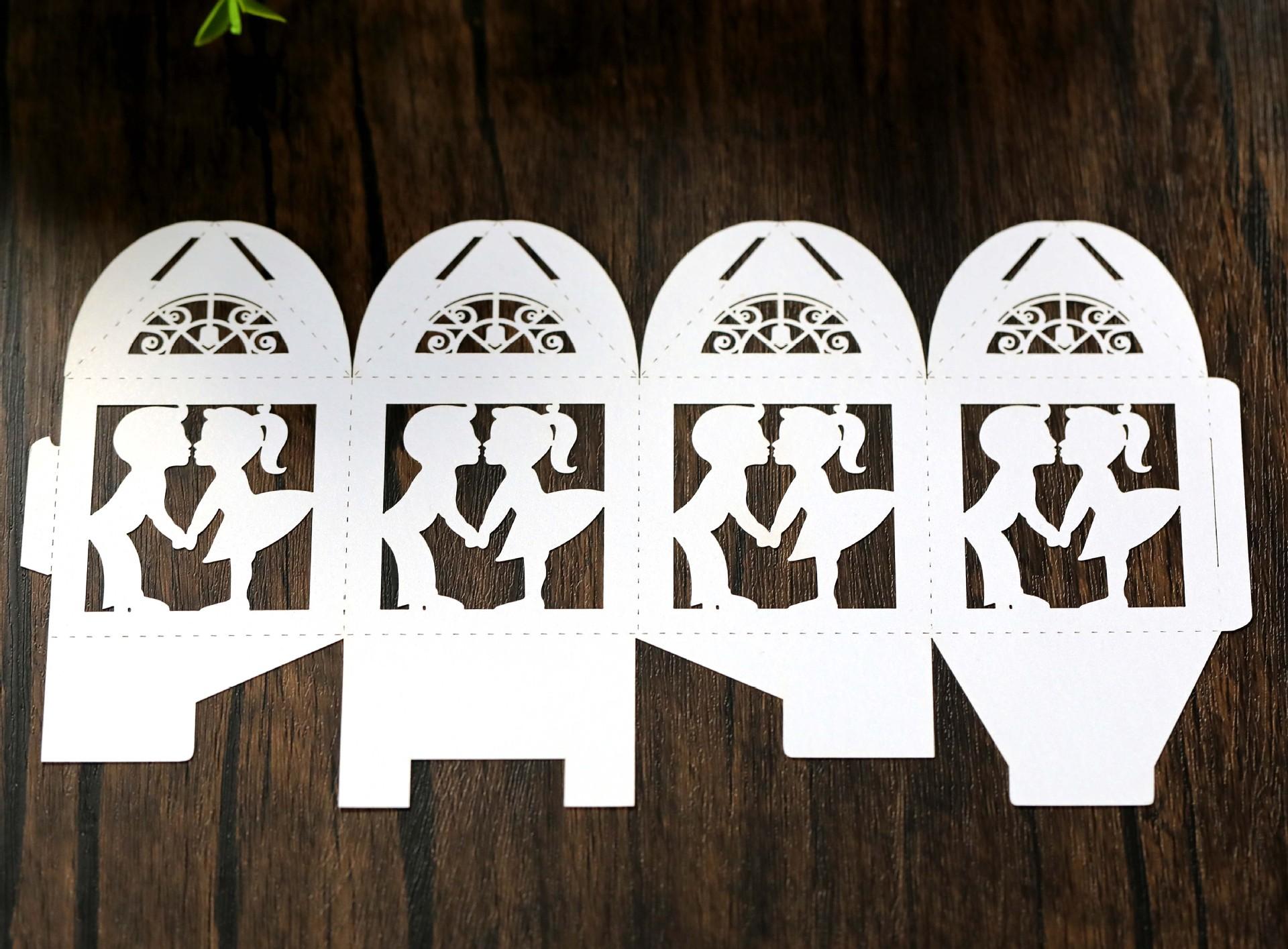 Podemos realizar la personalización de varias flores de papel huecas para regalos de bodas/bordes de pasteles/cajas de dulces de boda huecas con láser/todo tipo de juegos de cajas de papel huecas con láser para embalaje/tarjetas de felicitación huecas/invitaciones huecas/tarjetas de asiento y otros diversos accesorios artesanales relacionados con el láser.