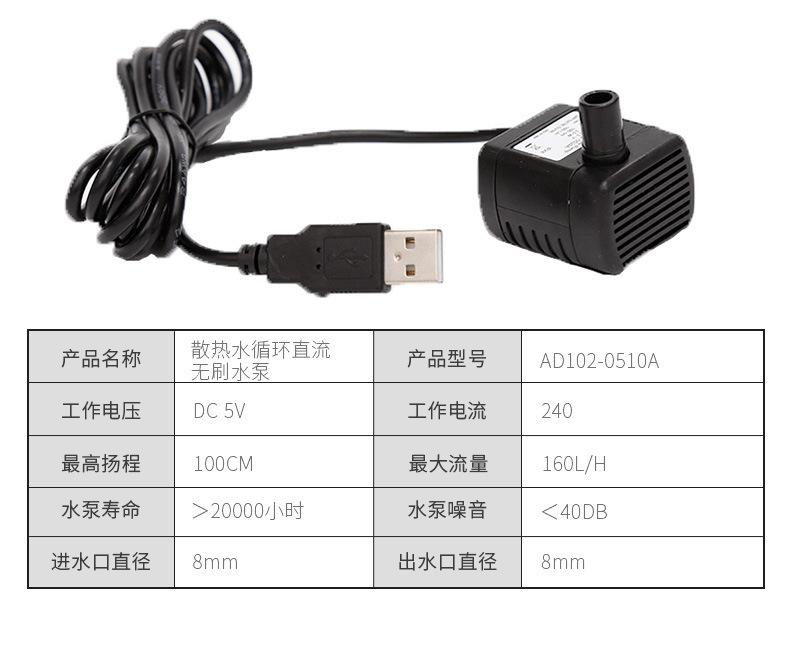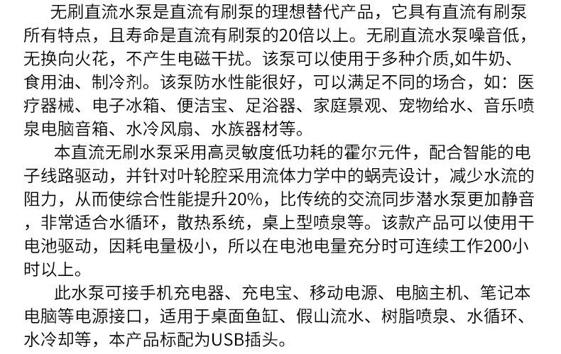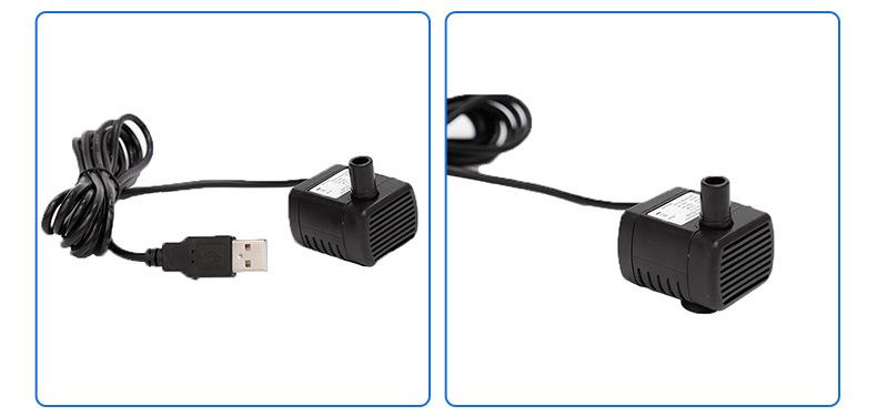 Esta bomba de agua se puede conectar a interfaces de energía como cargadores de teléfonos móviles, bancos de energía, fuentes de energía móviles, hosts de computadora, computadoras portátiles, etc. Es adecuada para peceras de escritorio, agua de rocalla, fuentes de resina, circulación de agua, refrigeración por agua, etc. Este producto viene de serie con un enchufe USB.