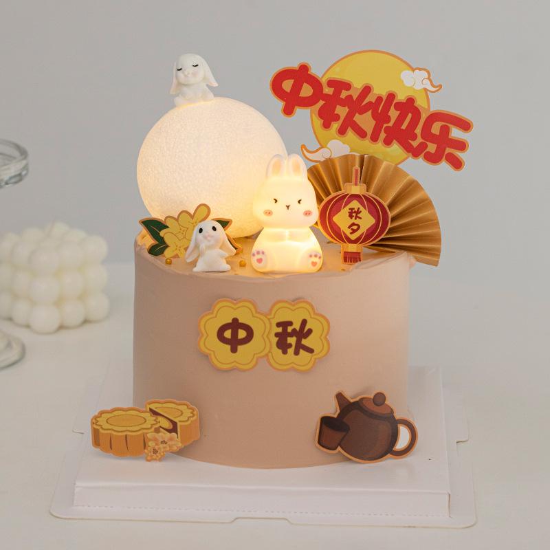 Decoración de lámpara de conejo de luna luminosa del Festival del Medio Otoño, decoración de pastel, abanico enchufable, pastel de luna, Feliz Día Festivo, adorno enchufable de Conejo de Jade