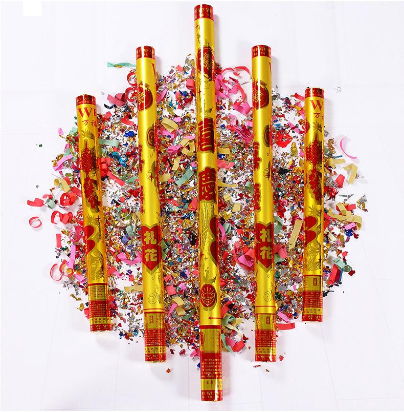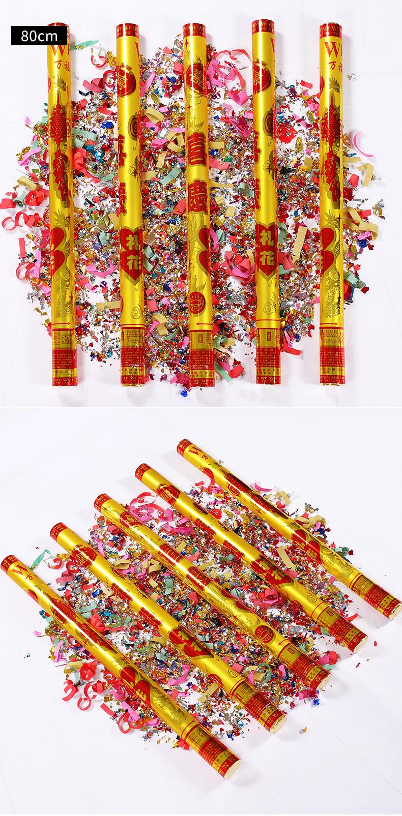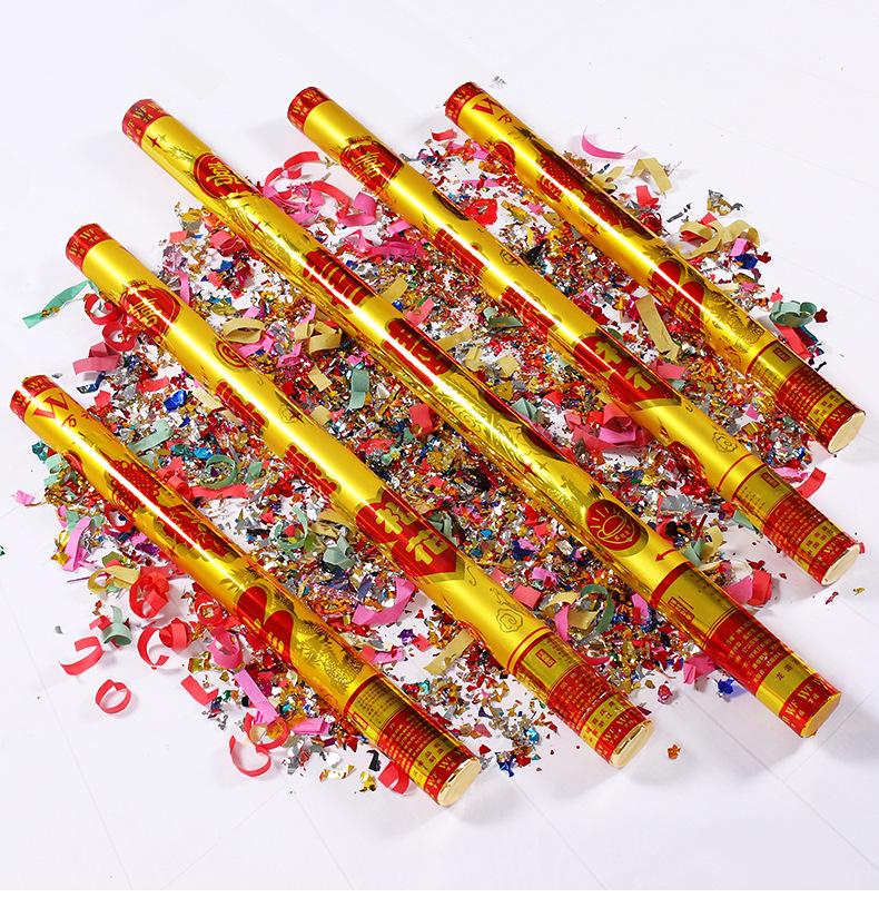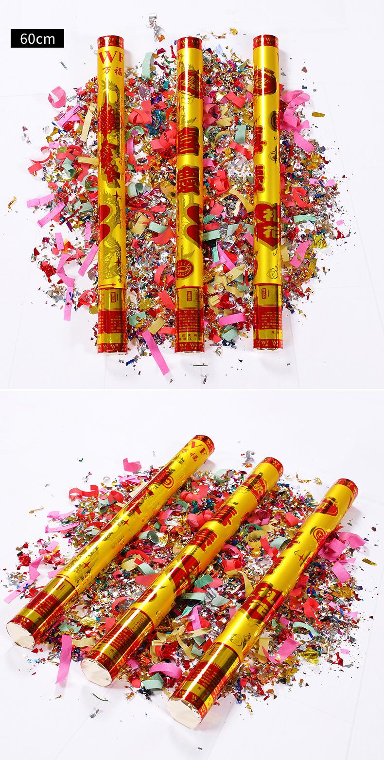 Respuesta: Los confeti vienen en longitudes de 40 cm, 60 cm, 80 cm y 100 cm; y en rellenos, vienen en confeti de papel de colores, caracteres chinos para "felicidad" y pétalos de rosa; en general, los de 40 cm de pétalos de rosa y caracteres chinos para "felicidad" son mejores para uso en interiores; los de 60 cm y 80 cm de confeti de papel de colores se recomiendan para uso en exteriores; la longitud de los confeti y el tipo de rellenos generalmente se eligen según el lugar del evento.