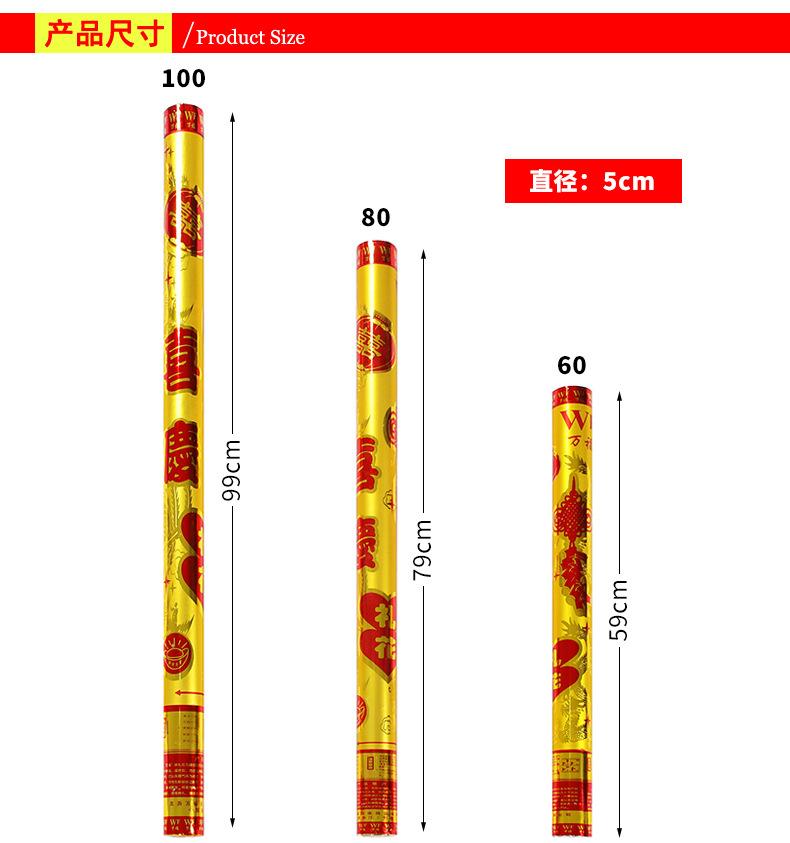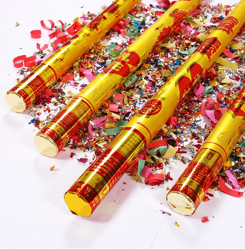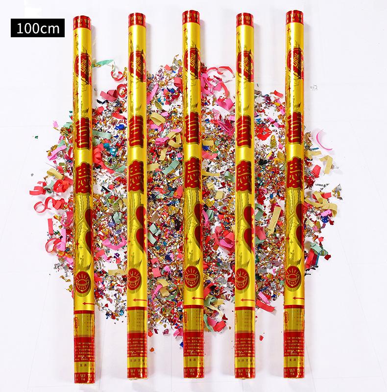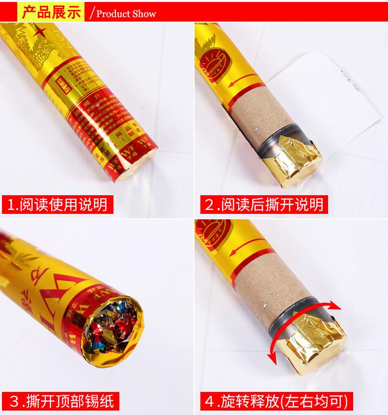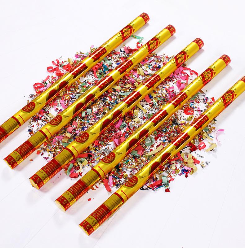 Respuesta: Los confeti vienen en longitudes de 40 cm, 60 cm, 80 cm y 100 cm; y en rellenos, vienen en confeti de papel de colores, caracteres chinos para "felicidad" y pétalos de rosa; en general, los de 40 cm de pétalos de rosa y caracteres chinos para "felicidad" son mejores para uso en interiores; los de 60 cm y 80 cm de confeti de papel de colores se recomiendan para uso en exteriores; la longitud de los confeti y el tipo de rellenos generalmente se eligen según el lugar del evento.