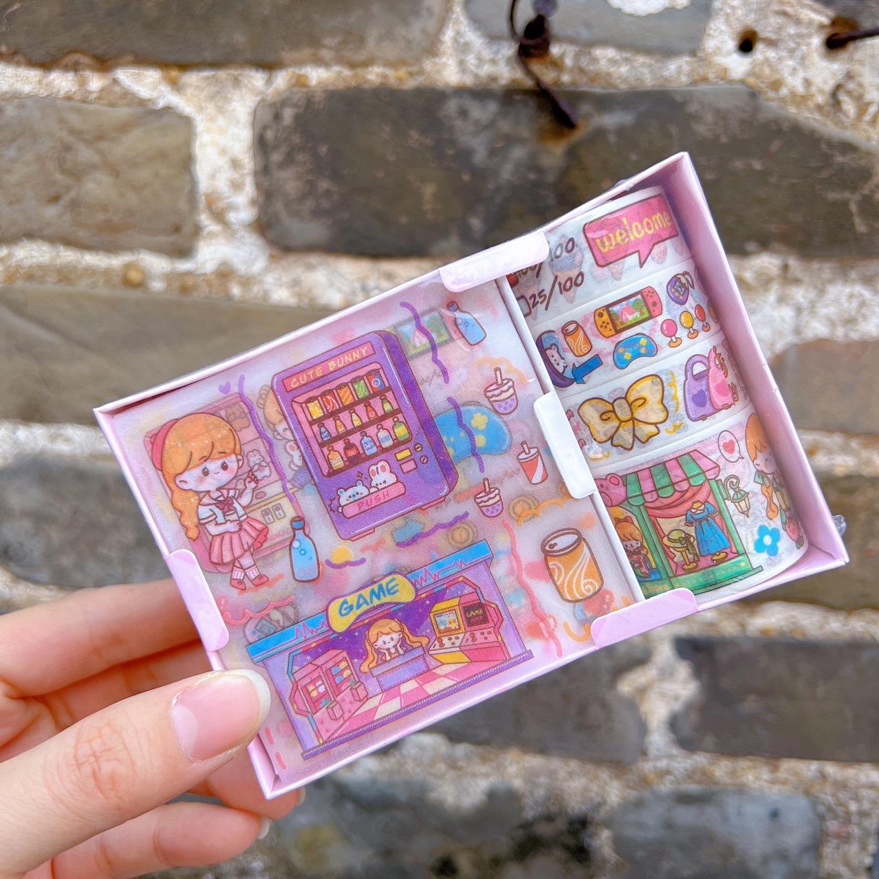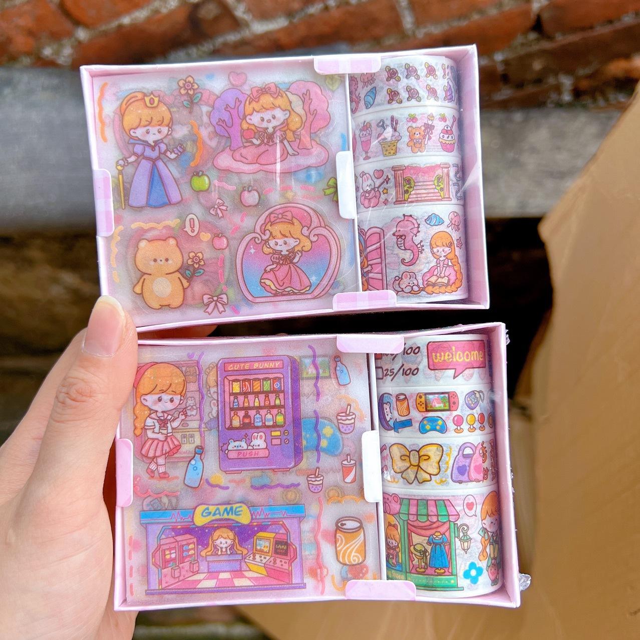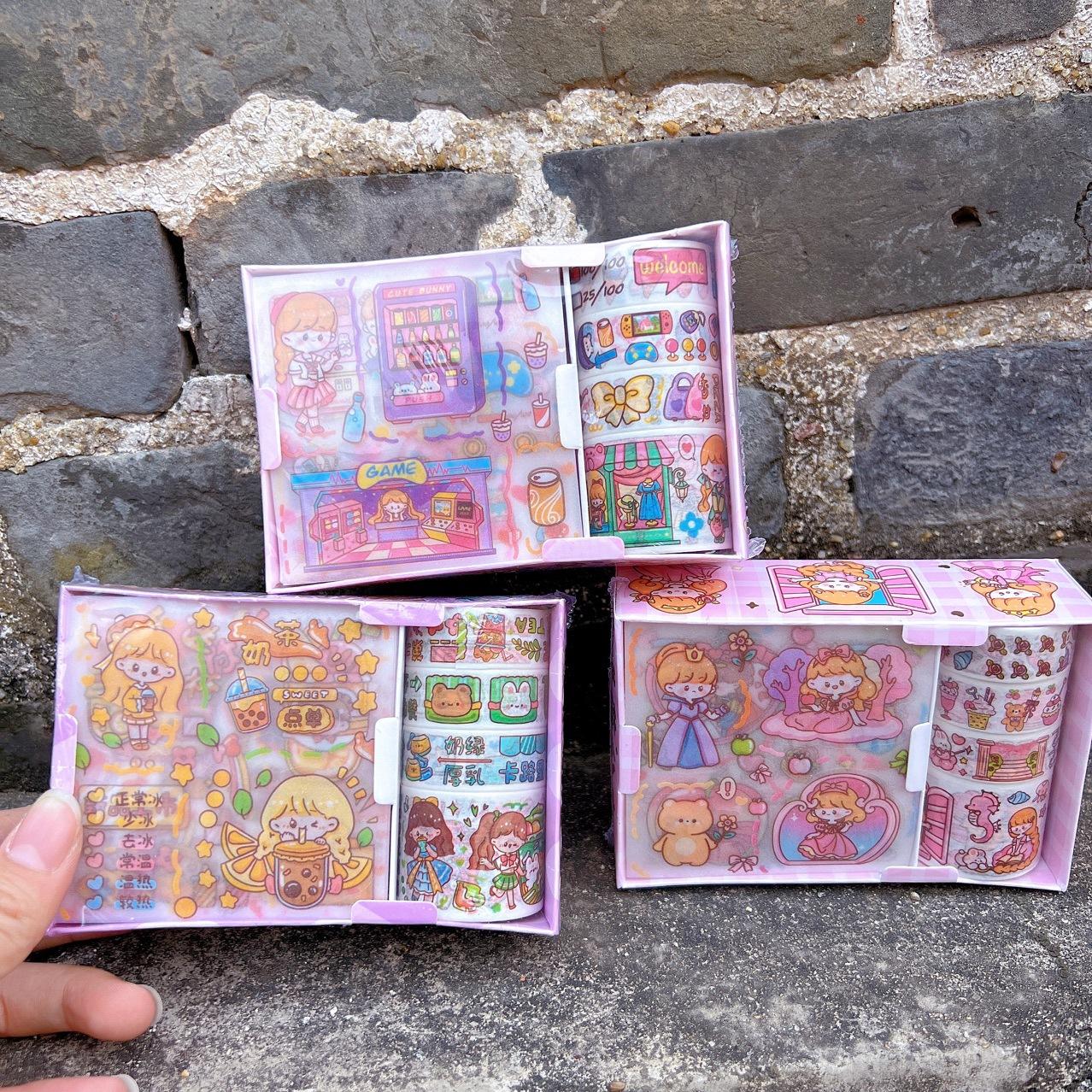 Venta caliente lindo juego de cinta adhesiva con forma de mano de dibujos animados para niña, mascota, decoración de corazón transparente para niña, caja de pegatinas con cinta esmerilada
