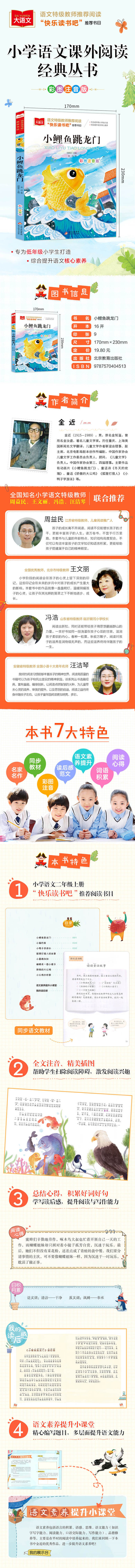 """La carpa pequeña saltando sobre la Puerta del Dragón" es la obra representativa de Jin Jin. La historia cuenta sobre un grupo de carpas pequeñas que, después de escuchar la historia de su abuela sobre sus antepasados saltando sobre la Puerta del Dragón, emprenden un viaje para encontrar la Puerta del Dragón. Nadaron a través del río y los rápidos, superaron muchas dificultades y finalmente llegaron frente a la Puerta del Dragón de sus sueños. Frente al alto embalse y las aguas turbulentas, las carpas pequeñas no se rindieron, sino que usaron su sabiduría y cooperación para saltar con éxito sobre el Embalse de la Puerta del Dragón juntas y ver el hermoso nuevo mundo. Como colección de los cuentos de hadas del Sr. Jin Jin, este libro también incluye excelentes cuentos de hadas como "El gatito pescando", "La historia del zorro cazando al cazador" y "El patito aprendiendo a nadar"."