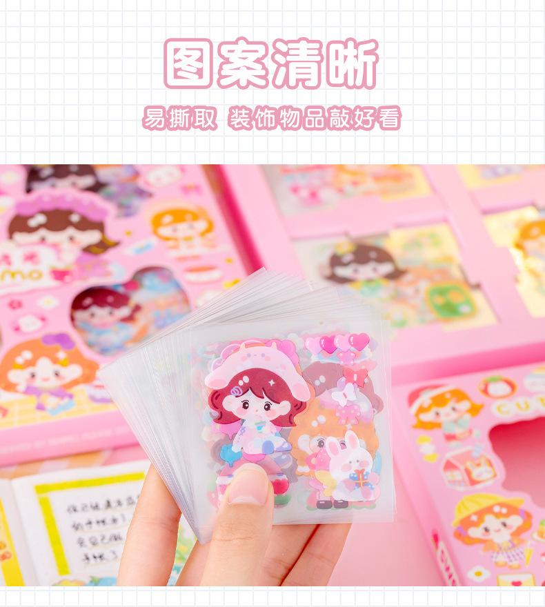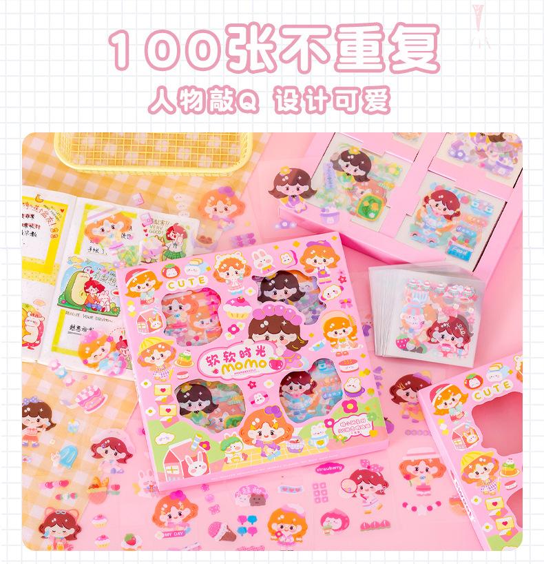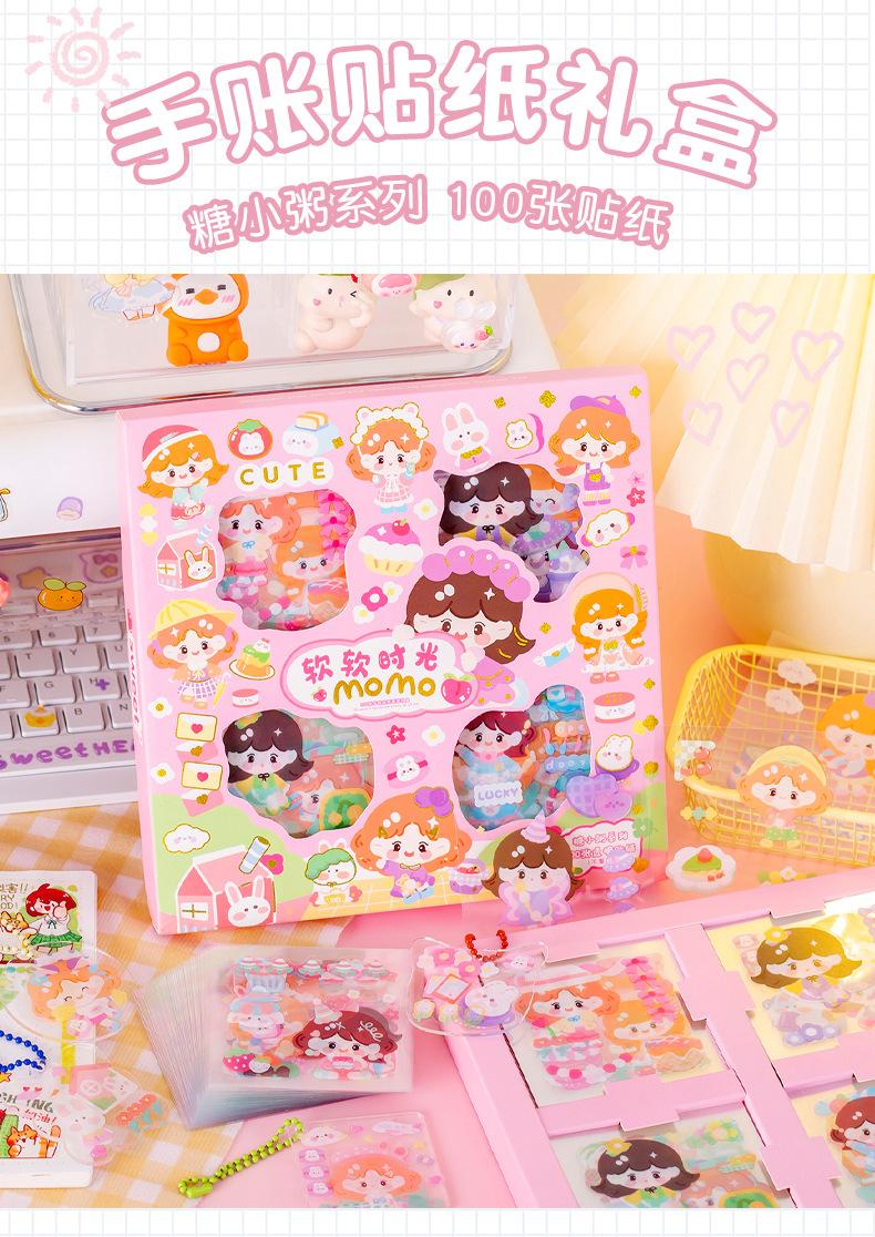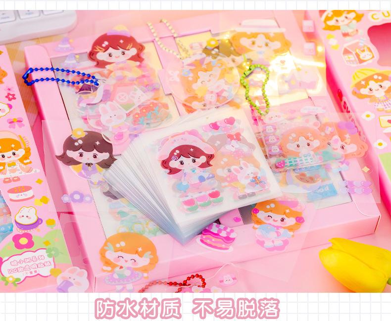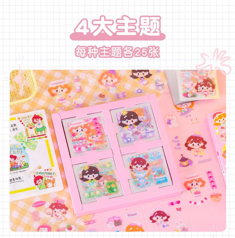 Pegatinas de cuenta de mano, 100 pegatinas de PET de dibujos animados no repetibles en caja de 7 cm, linda chica, material de decoración de tarjetas DIY