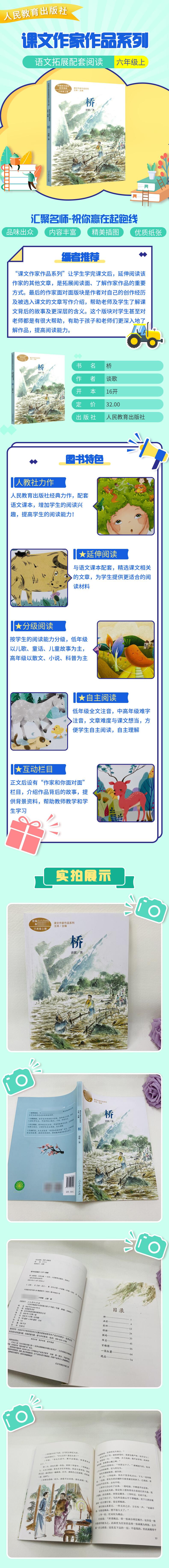 El Puente es una colección cuidadosamente seleccionada de cuentos cortos del Maestro Tan Ge. La dificultad es comparable a la del libro de texto Puente. El texto es conciso y la trama es tortuosa. Cuenta principalmente las historias de artistas famosos, héroes y hombres justos a finales de la dinastía Qing y la República de China, y elogia el espíritu caballeresco y los profundos sentimientos de los personajes. Se acompaña de imágenes a color que coinciden con el contenido de las obras, notación fonética para los caracteres difíciles y consideración de los estándares lingüísticos y textuales. También conserva el sabor original de los clásicos, lo que facilita la lectura independiente para los alumnos de sexto grado.