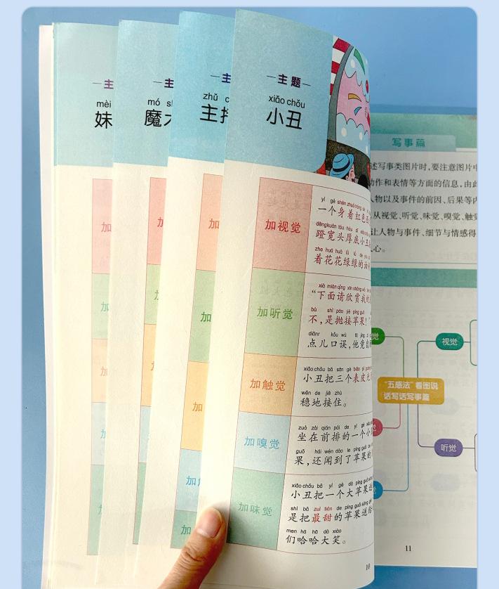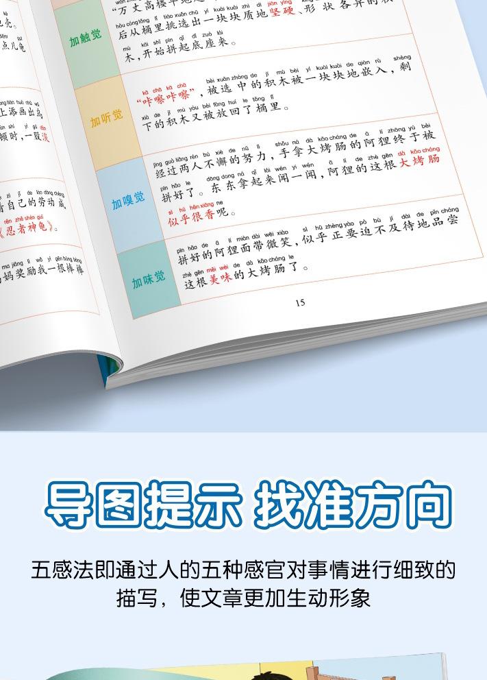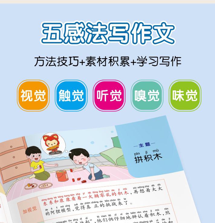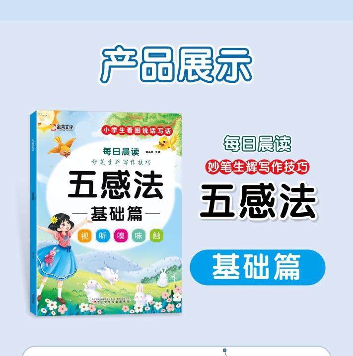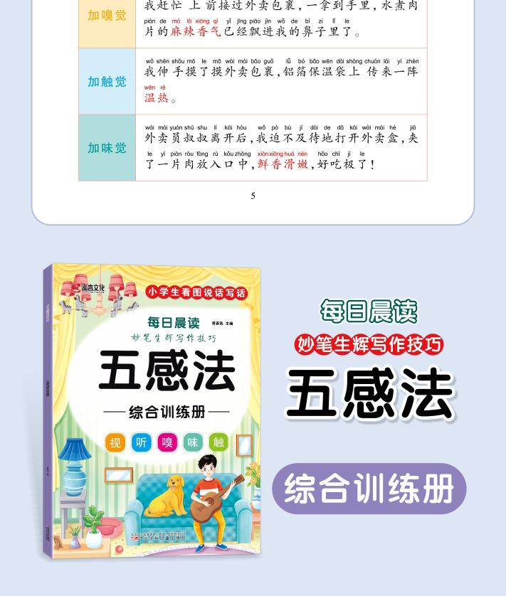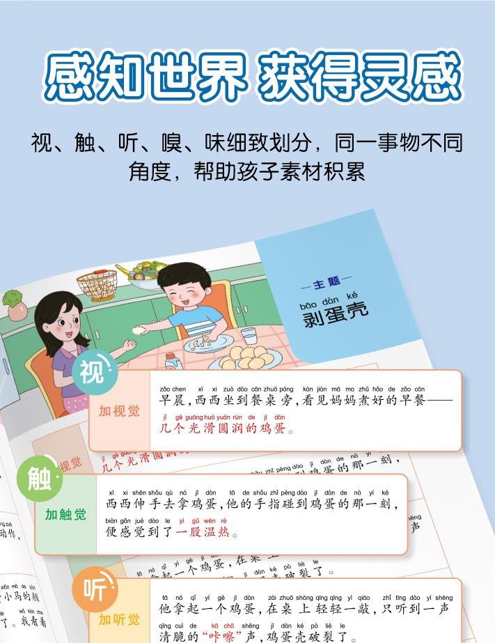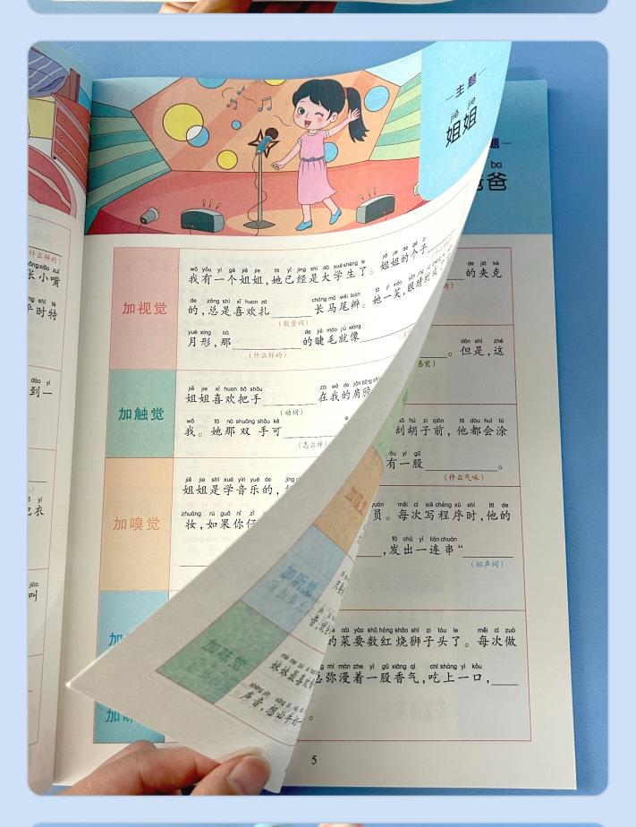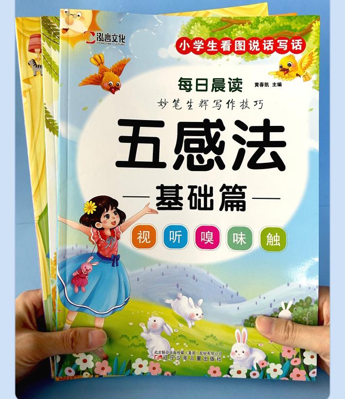 Lectura matutina diaria de sintaxis ampliada y cinco sentidos, alumnos de primaria leen imágenes, hablan, escriben palabras, libros sobre habilidades de redacción de composiciones.
