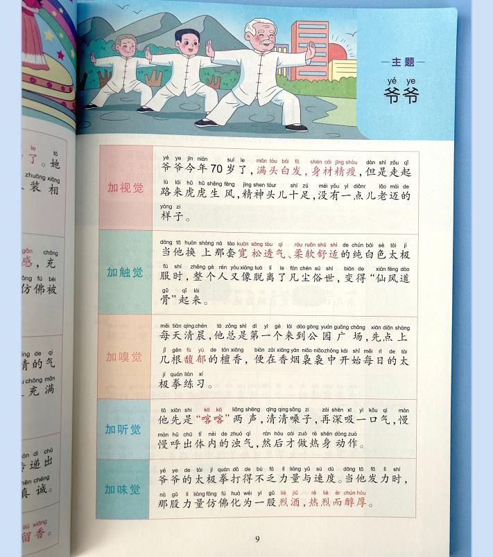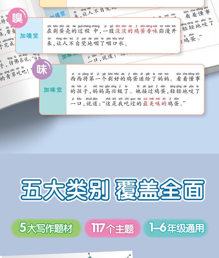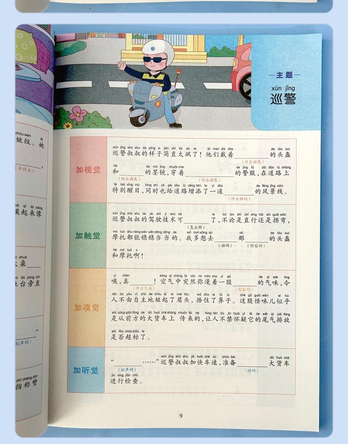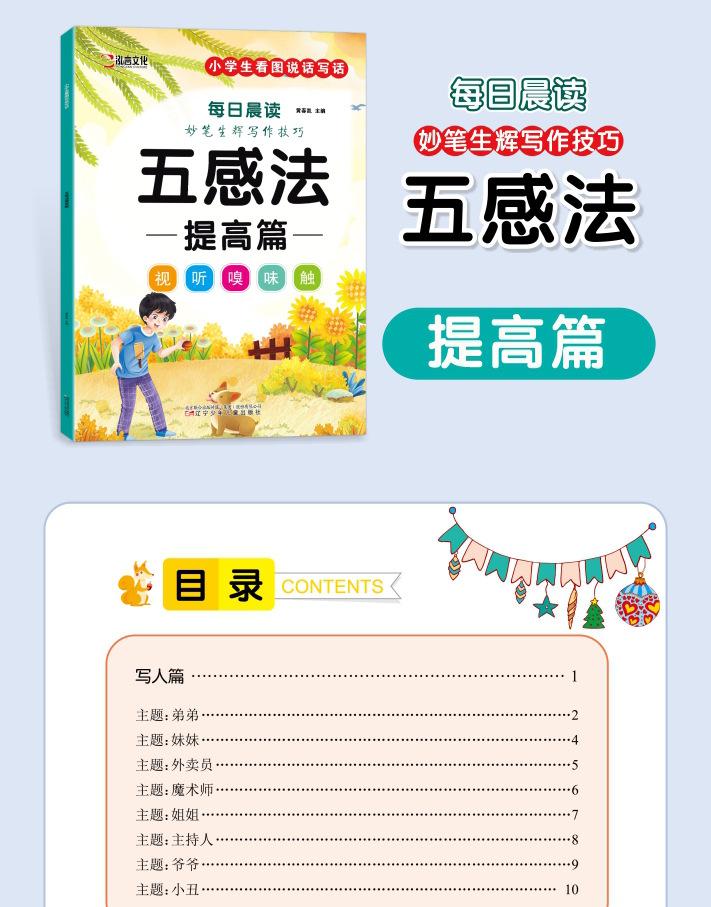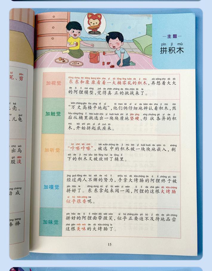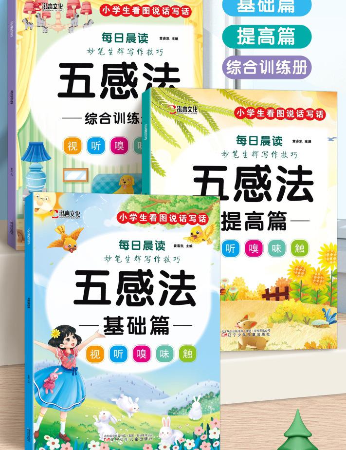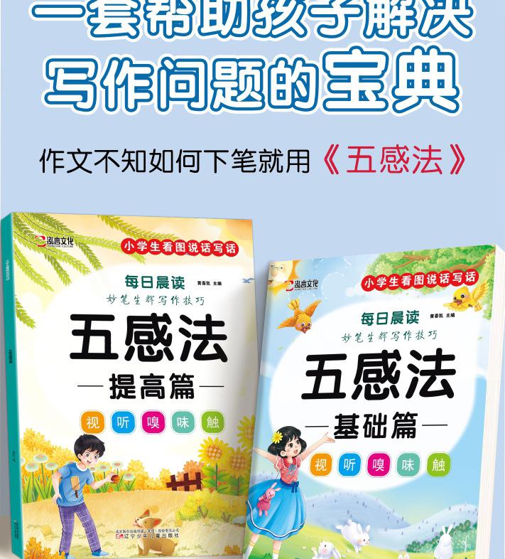 Lectura matutina diaria de sintaxis ampliada y cinco sentidos, alumnos de primaria leen imágenes, hablan, escriben palabras, libros sobre habilidades de redacción de composiciones.