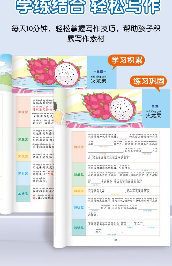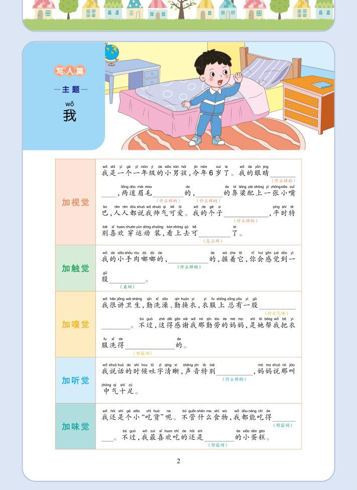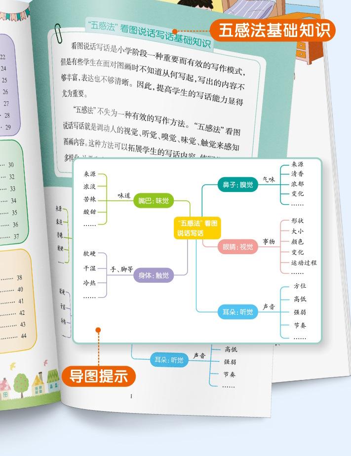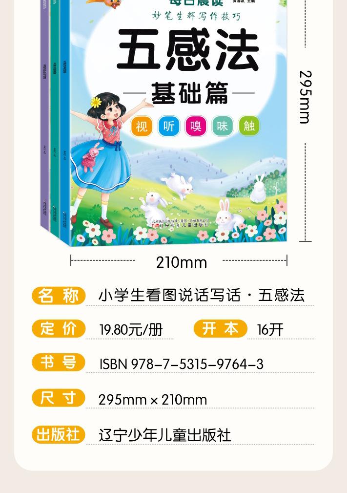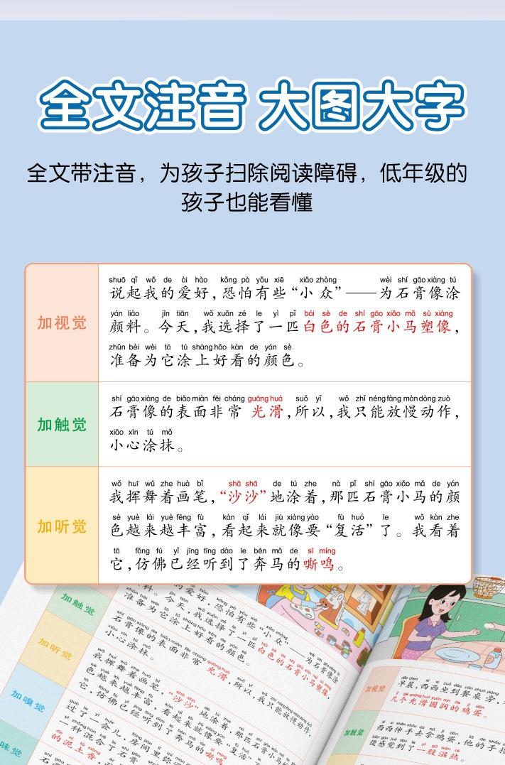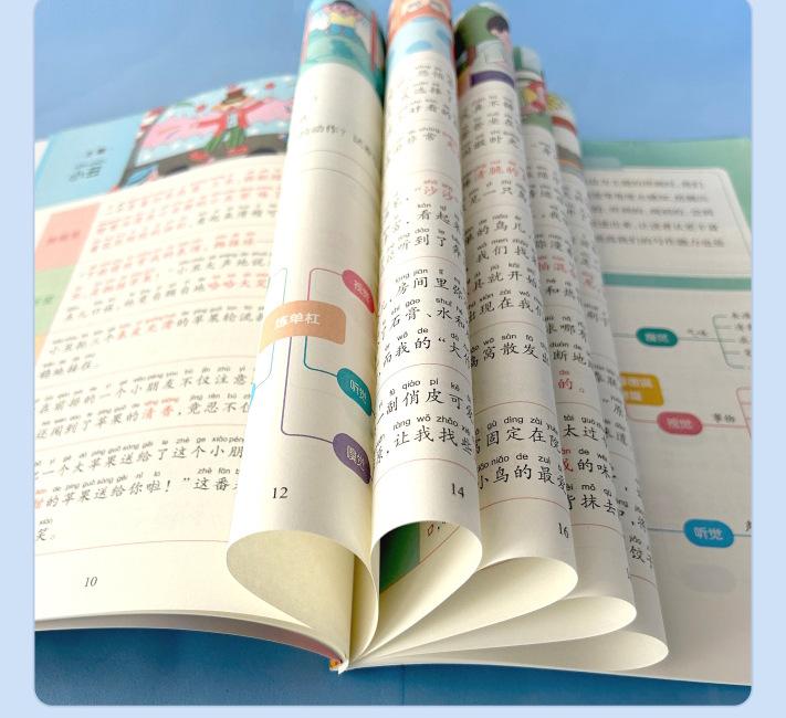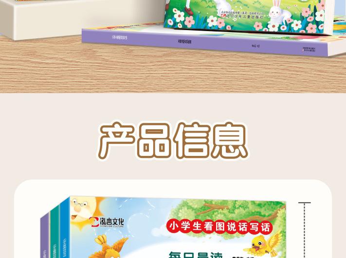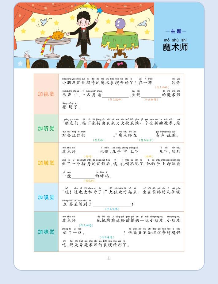 Lectura matutina diaria de sintaxis ampliada y cinco sentidos, alumnos de primaria leen imágenes, hablan, escriben palabras, libros sobre habilidades de redacción de composiciones.