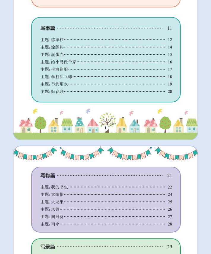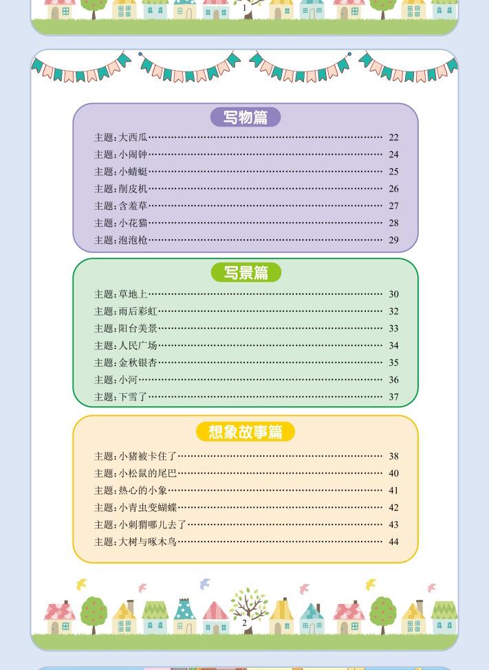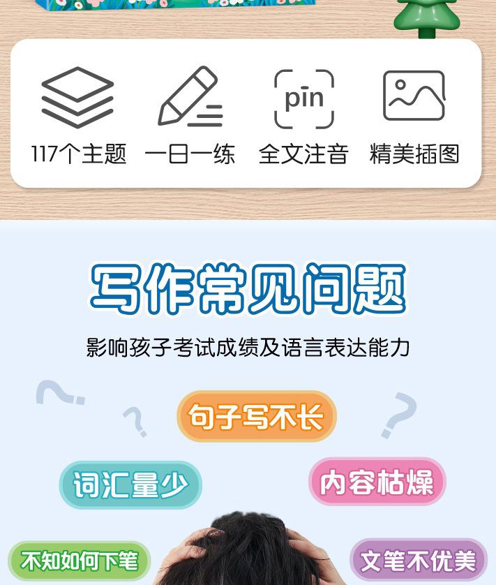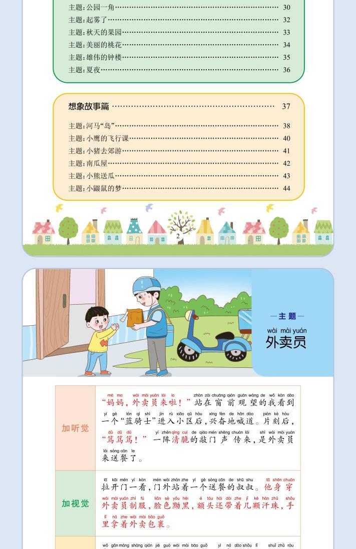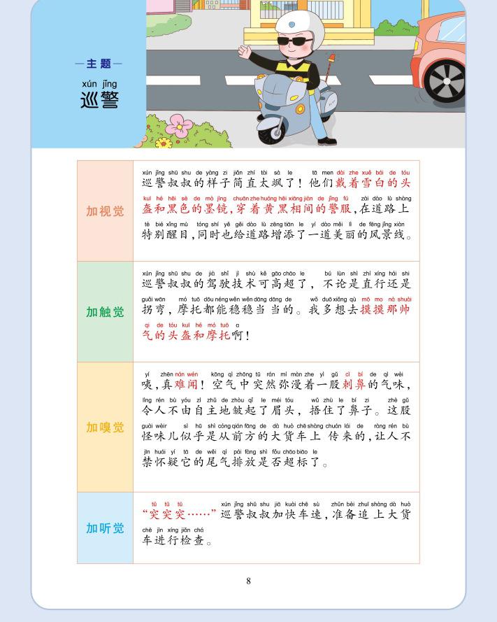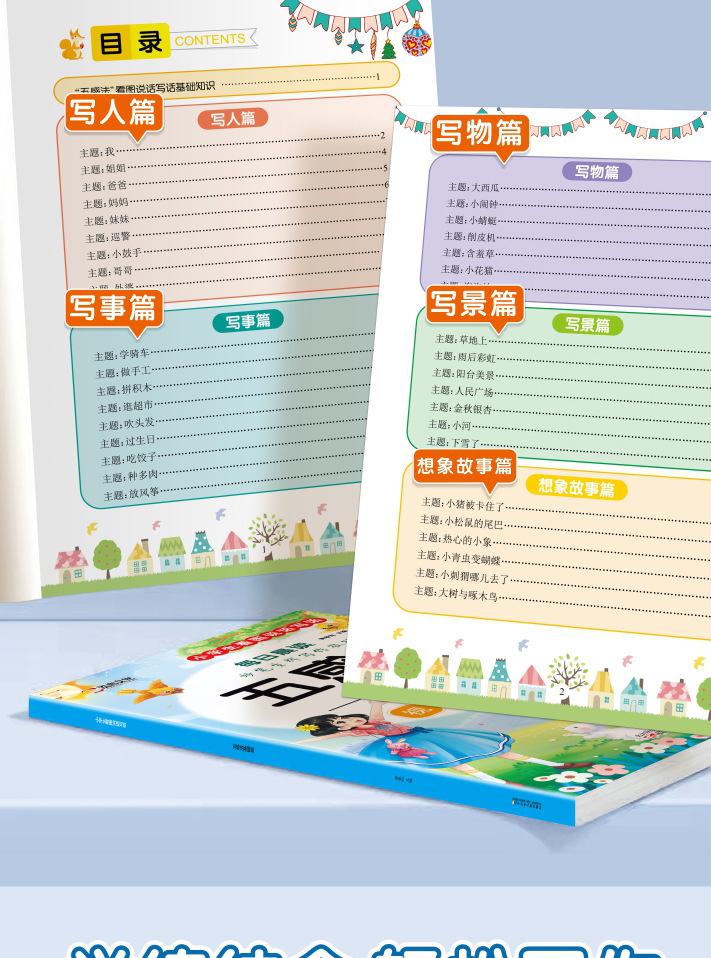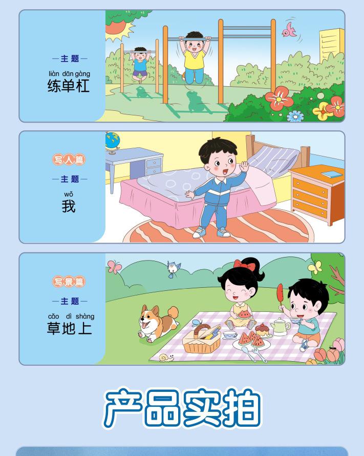 Lectura matutina diaria de sintaxis ampliada y cinco sentidos, alumnos de primaria leen imágenes, hablan, escriben palabras, libros sobre habilidades de redacción de composiciones.