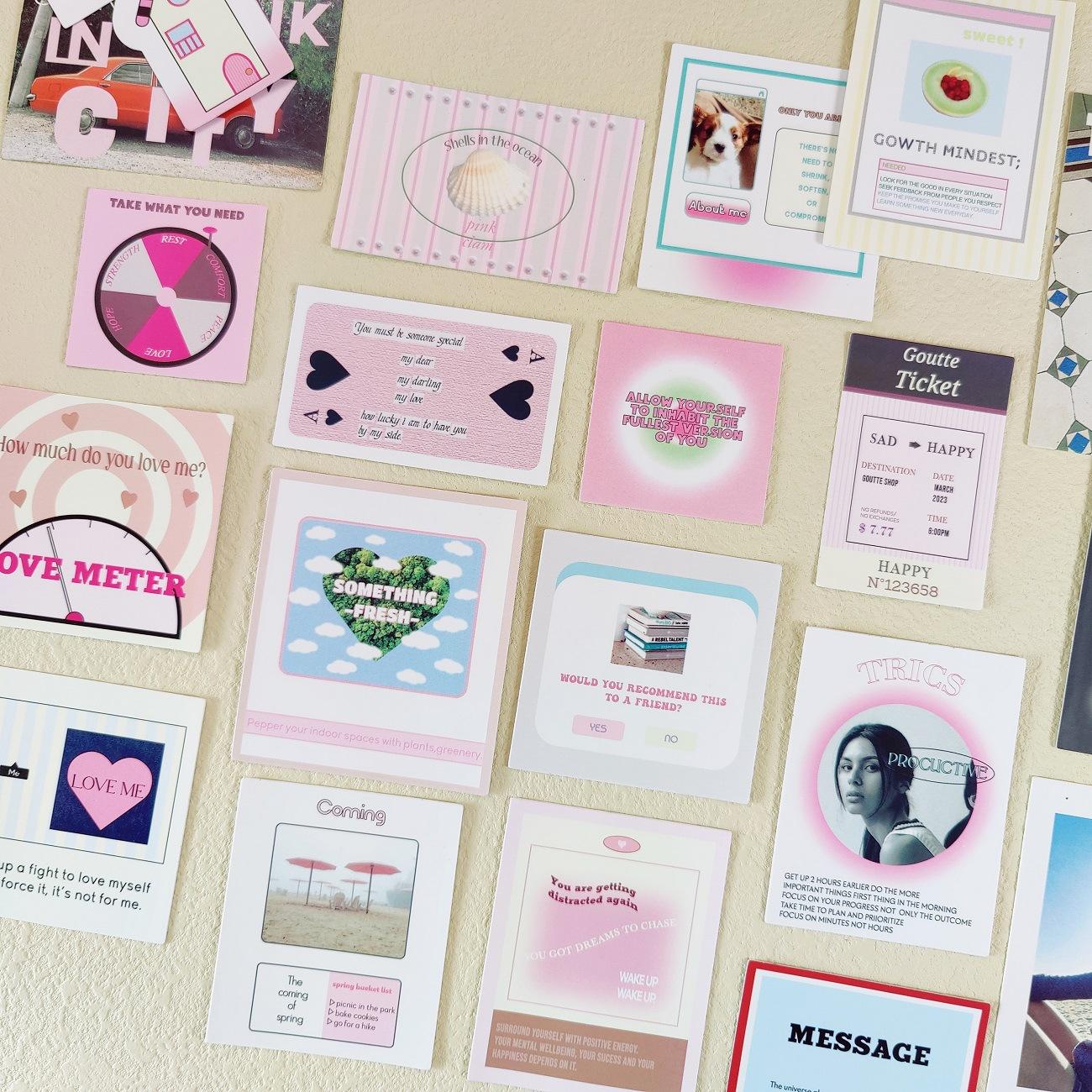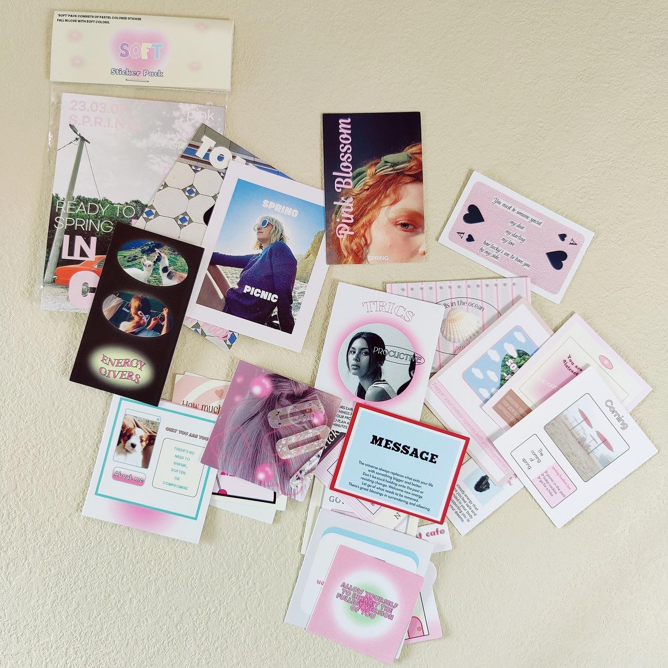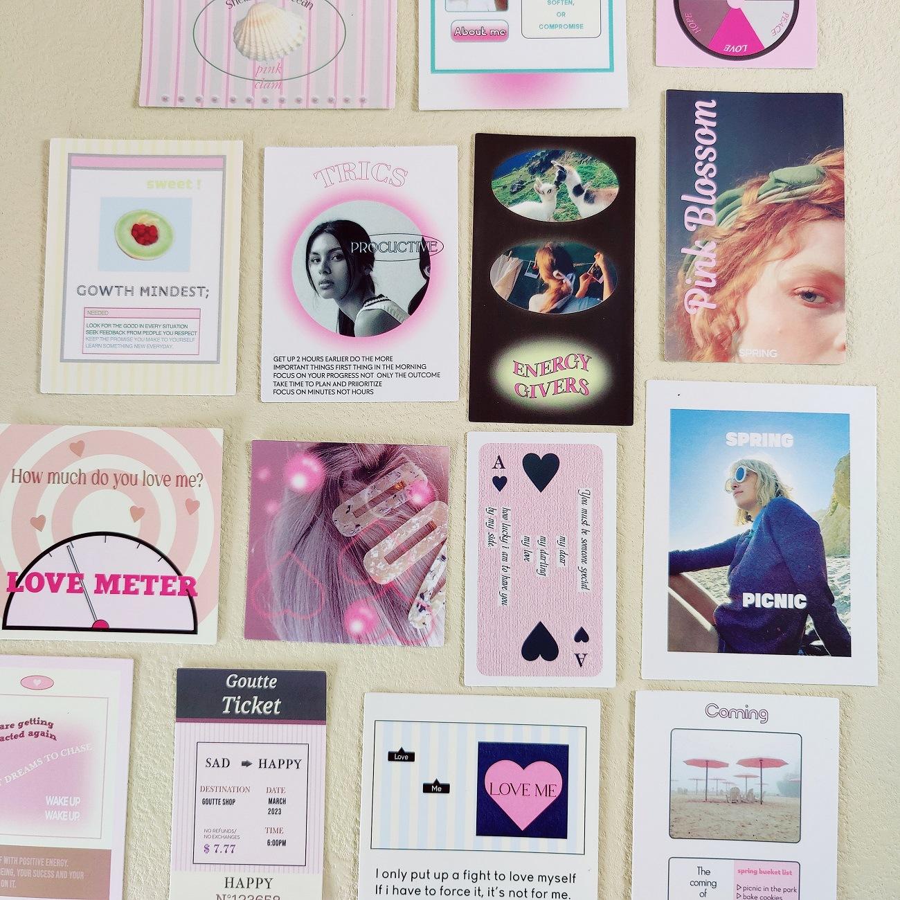 El mismo bolso con pegatinas románticas rosas de gota coreana, notas, texto físico, etiqueta, cuenta de mano, pose, material