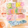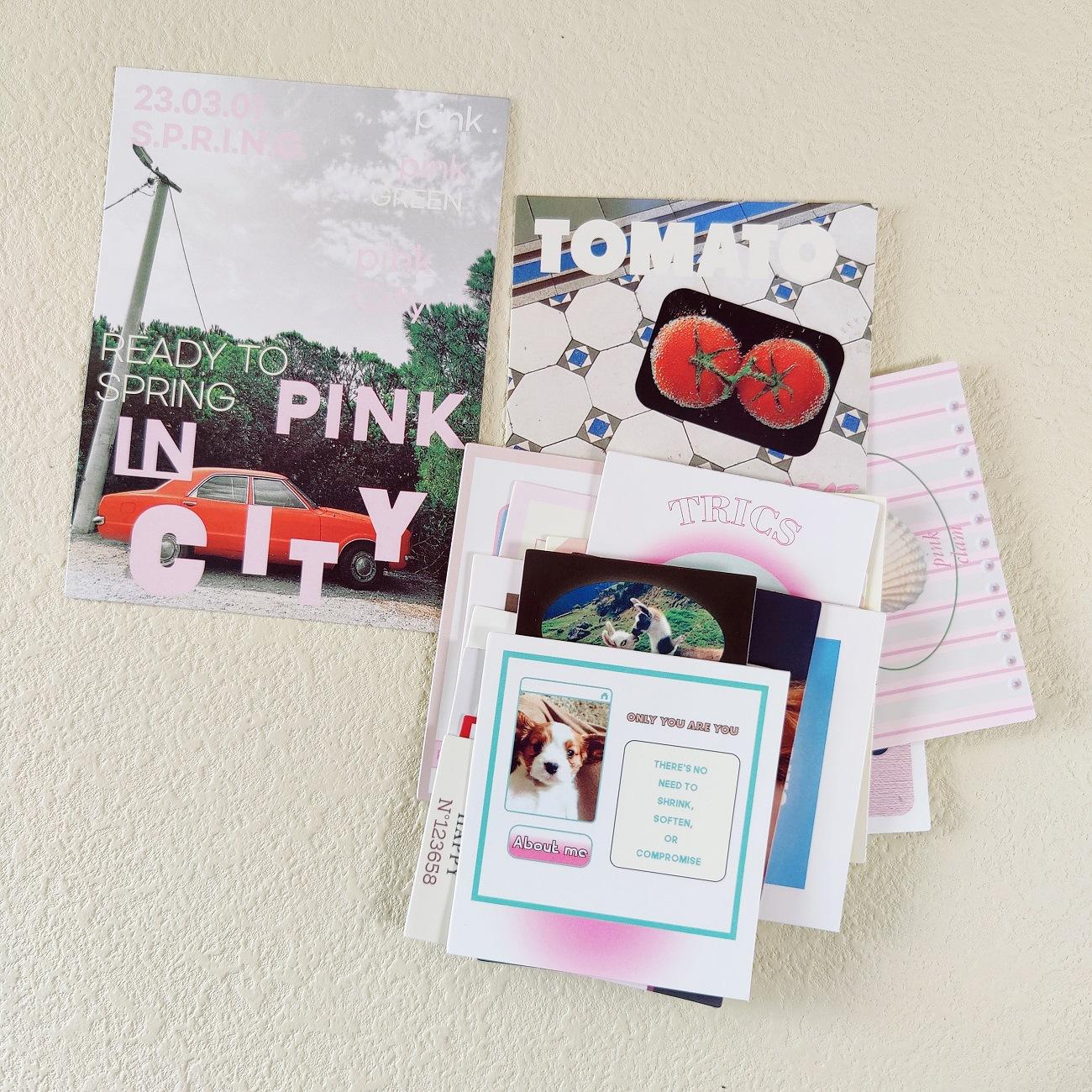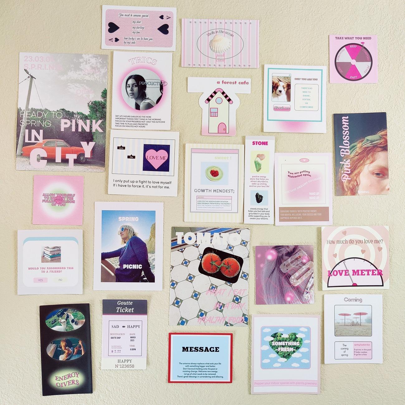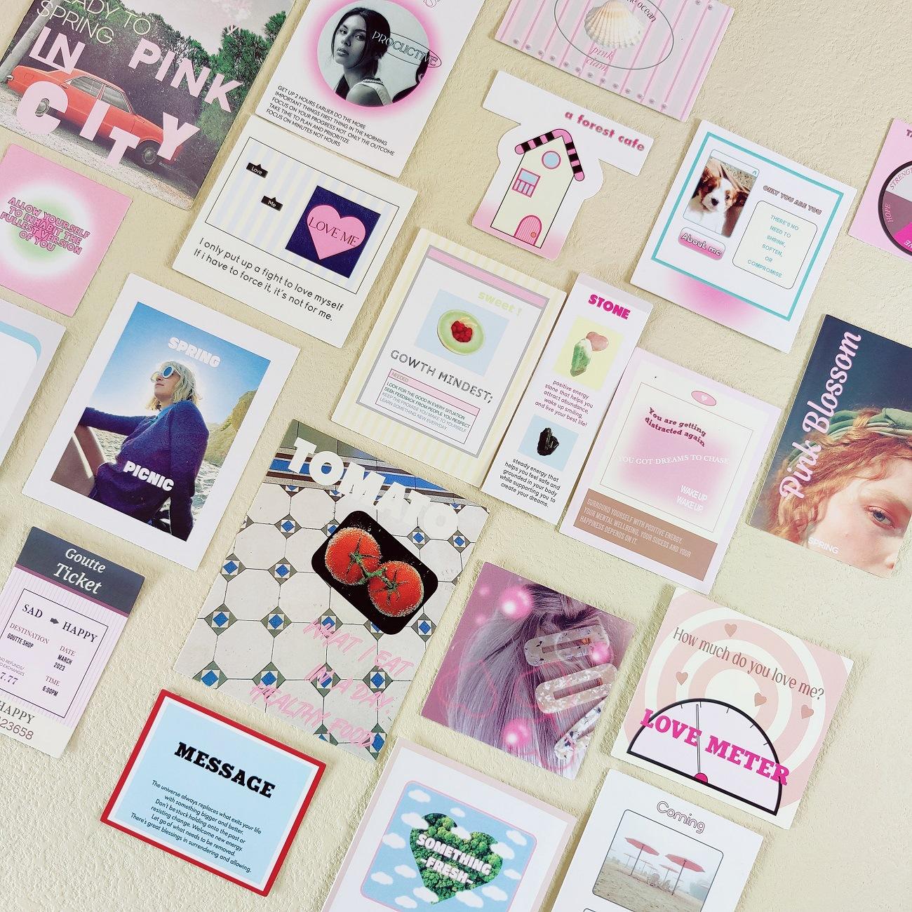 El mismo bolso con pegatinas románticas rosas de gota coreana, notas, texto físico, etiqueta, cuenta de mano, pose, material