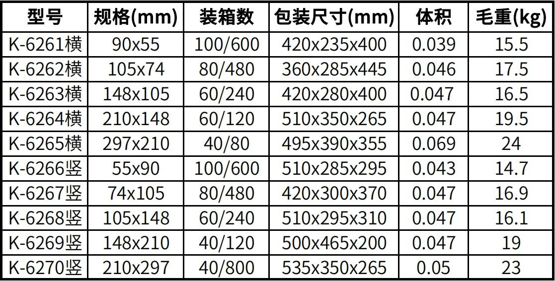 K-6261 horizontal 90 * 55mm, K-6262 horizontal 105 * 74mm, K-6263 horizontal 148 * 105mm, K-6264 horizontal 21...