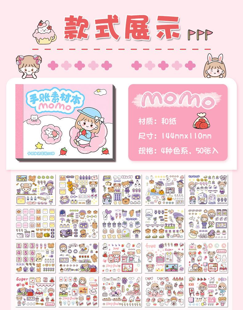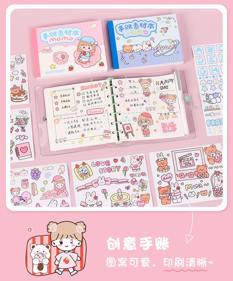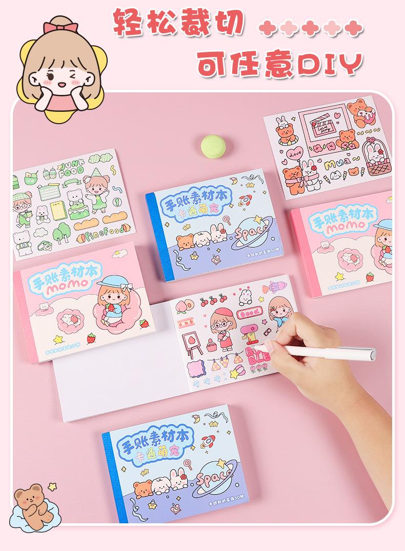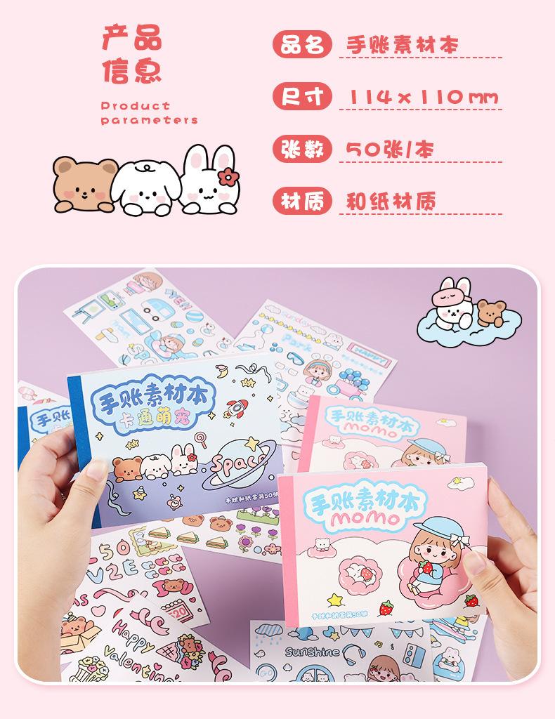 Libro de material para cuaderno Tamaño: 14.5*11cm Cubierta: Cartulina blanca de 350g laminada Stickers: 50 hojas de papel japonés Embalaje: Envoltura retráctil individual