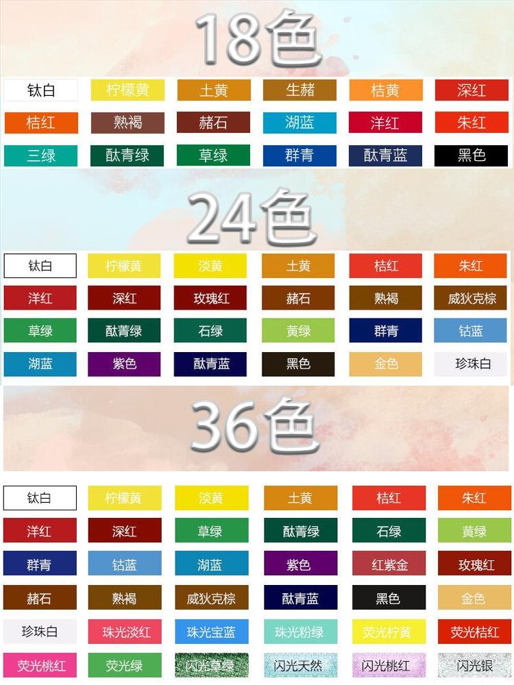 12 colors 10ml, 18 colors 10ml, 24 colors 10ml, 36 colors 10ml