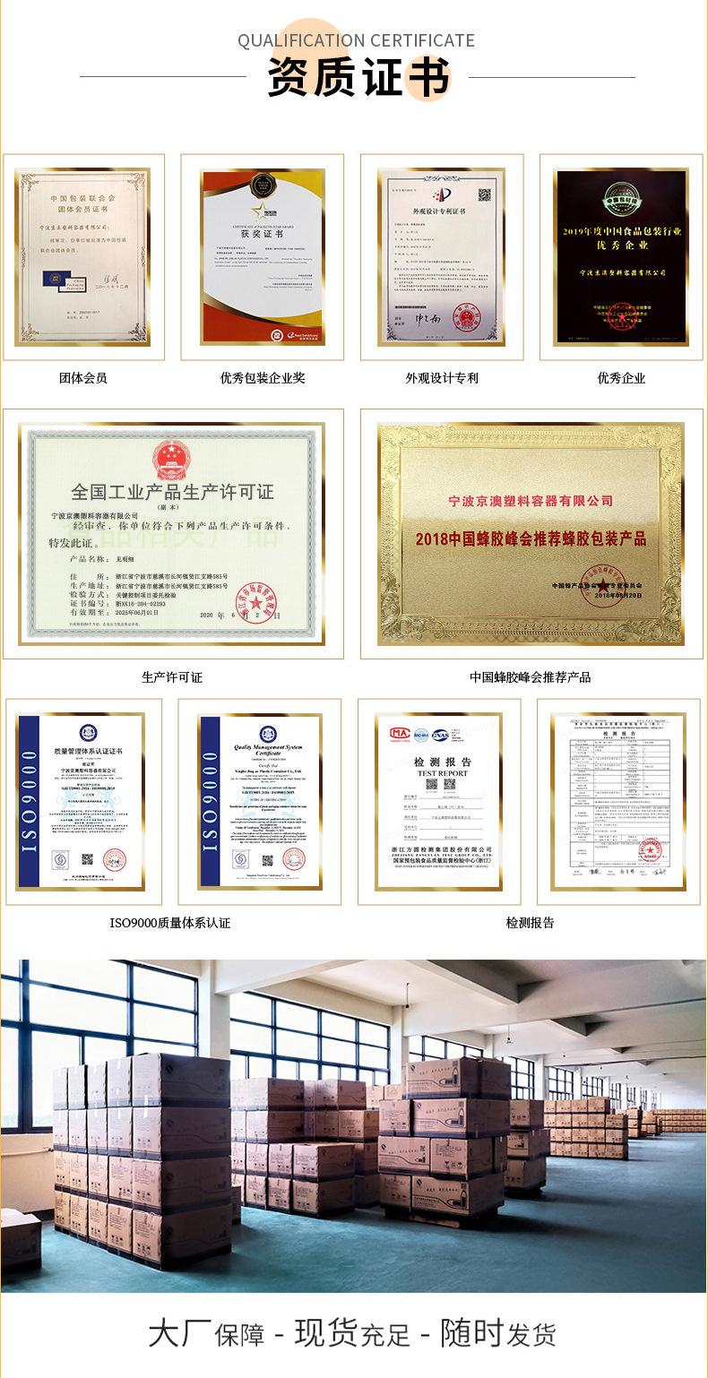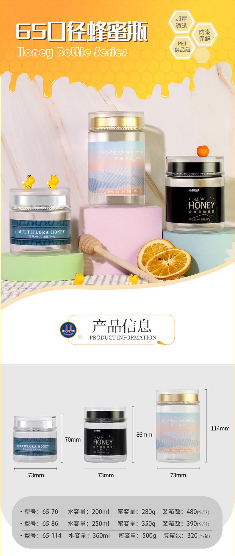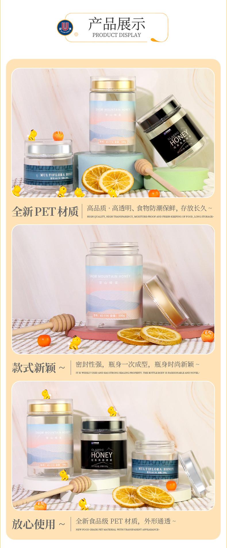 Botella de miel de alta calidad con tapa acrílica de doble capa de 65 puertos, botella de plástico PET transparente, frasco sellado de ginseng americano de grado alimenticio