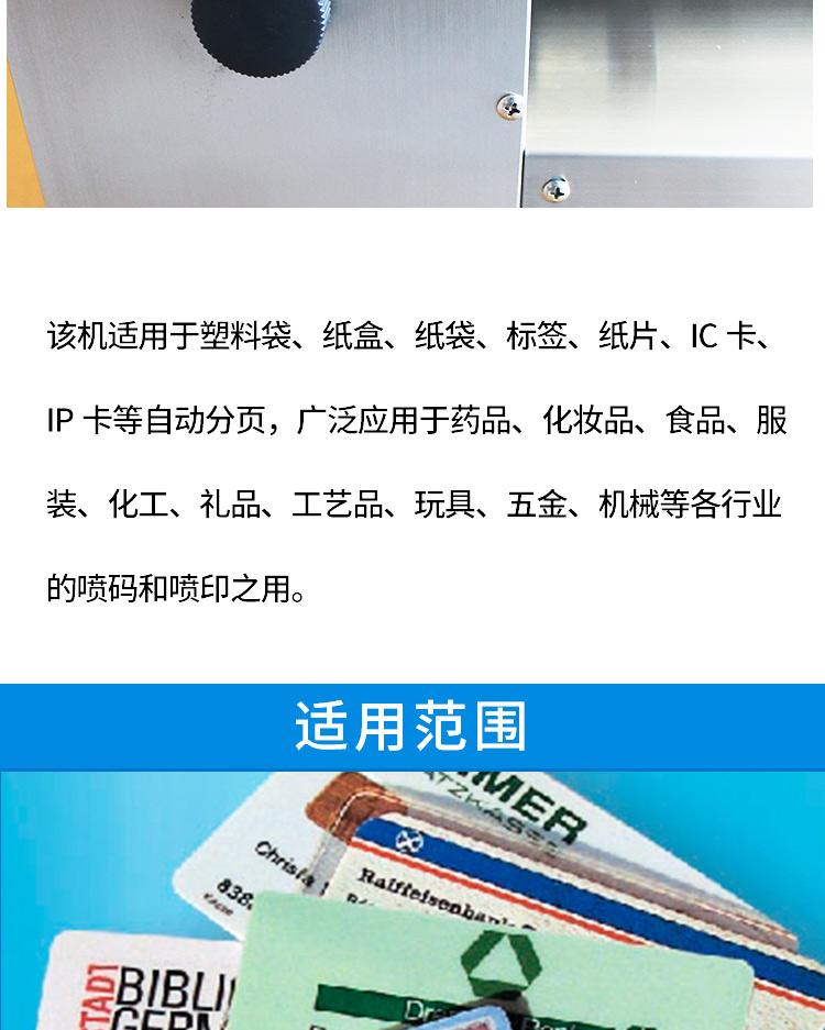 Ámbito de aplicación: Bolsas de embalaje: bolsas de plástico, cajas de papel, bolsas de papel, etiquetas, piezas de papel, etc. Tarjetas: tarjetas IC, tarjetas IP, etc.