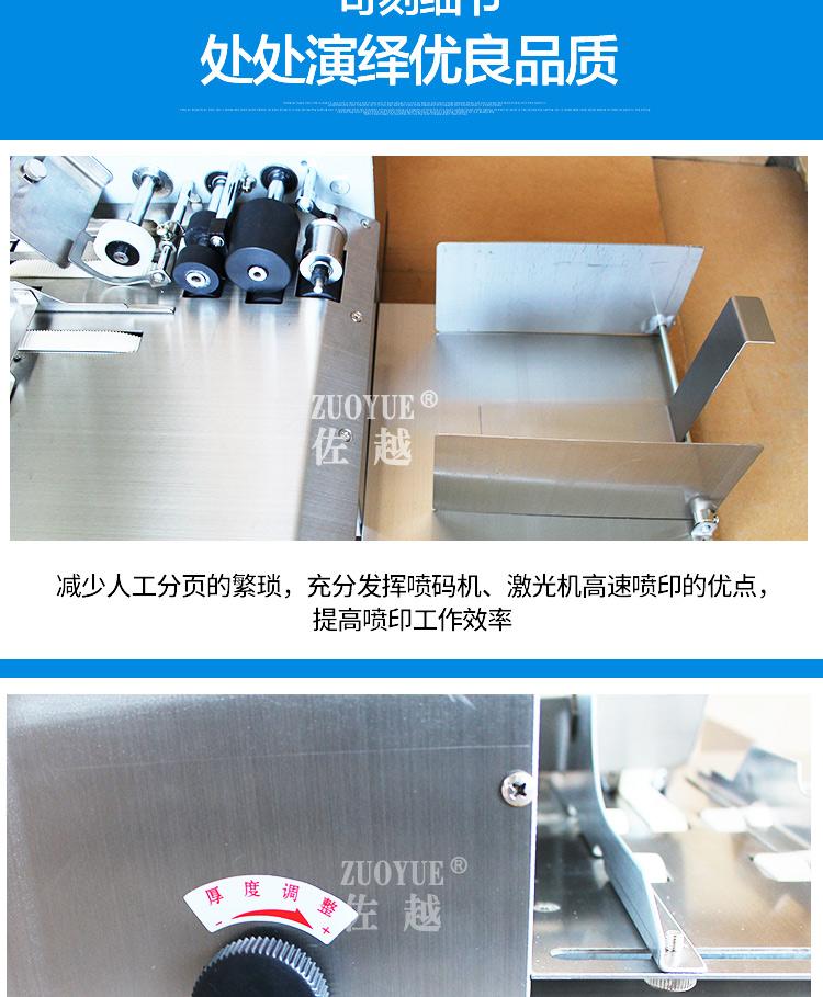 Características técnicas: Pagado de alta velocidad: regulación de velocidad continua de frecuencia variable de alta precisión, pagado automático de alta velocidad 10-600 piezas/minuto, puede mejorar en gran medida la eficiencia de producción. Posicionamiento de alta precisión: puede contar automáticamente, y también puede configurar automáticamente el número de páginas para detenerse automáticamente, el rango de ajuste es 1-9999 (necesita compartir la señal con la impresora de inyección de tinta y la máquina láser), lo que puede reducir la probabilidad de retrabajo. Diseño estructural razonable, reemplazo simple y rápido de las piezas de desgaste, puede reducir los costos de mantenimiento. Accesorios opcionales: dispositivo de recolección automática de material, fuente de señal de conteo y parada separada para la máquina paginadora.