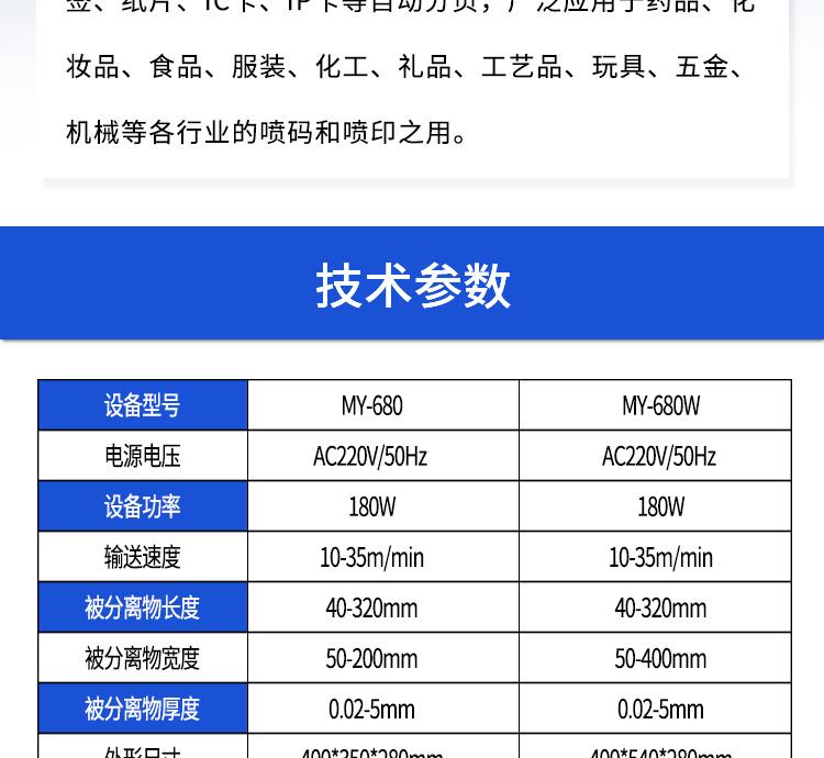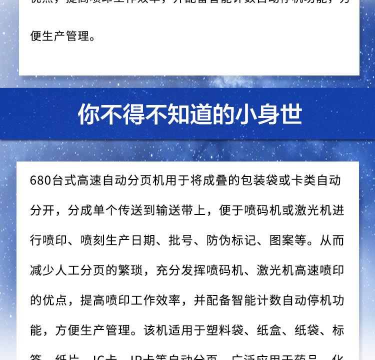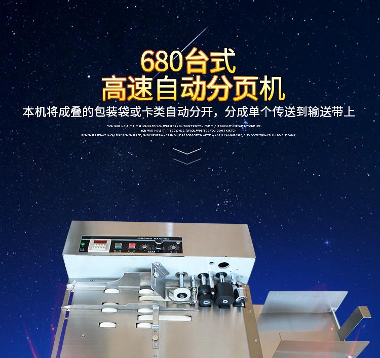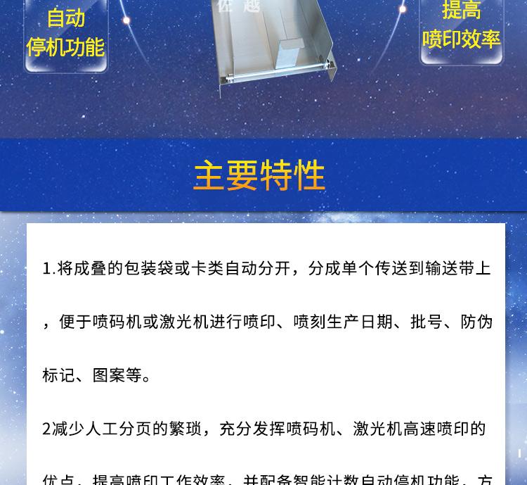 La paginadora automática de alta velocidad tipo fricción de pie se utiliza para separar automáticamente bolsas de embalaje o tarjetas apiladas y transferirlas a la cinta transportadora como piezas individuales, lo cual es conveniente para que la impresora de inyección de tinta o la máquina láser impriman y graben la fecha de producción, el número de lote, la marca antifalsificación, el patrón, etc., reduciendo así la tediosidad del paginado manual, aprovechando al máximo las ventajas de la impresión de alta velocidad de las impresoras de inyección de tinta y las máquinas láser, mejorando la eficiencia de la impresión, y equipada con función de conteo inteligente y apagado automático, lo cual es conveniente para la gestión de la producción, y se utiliza ampliamente en la codificación e impresión en diversas industrias como la farmacéutica, la cosmética y la alimentaria.