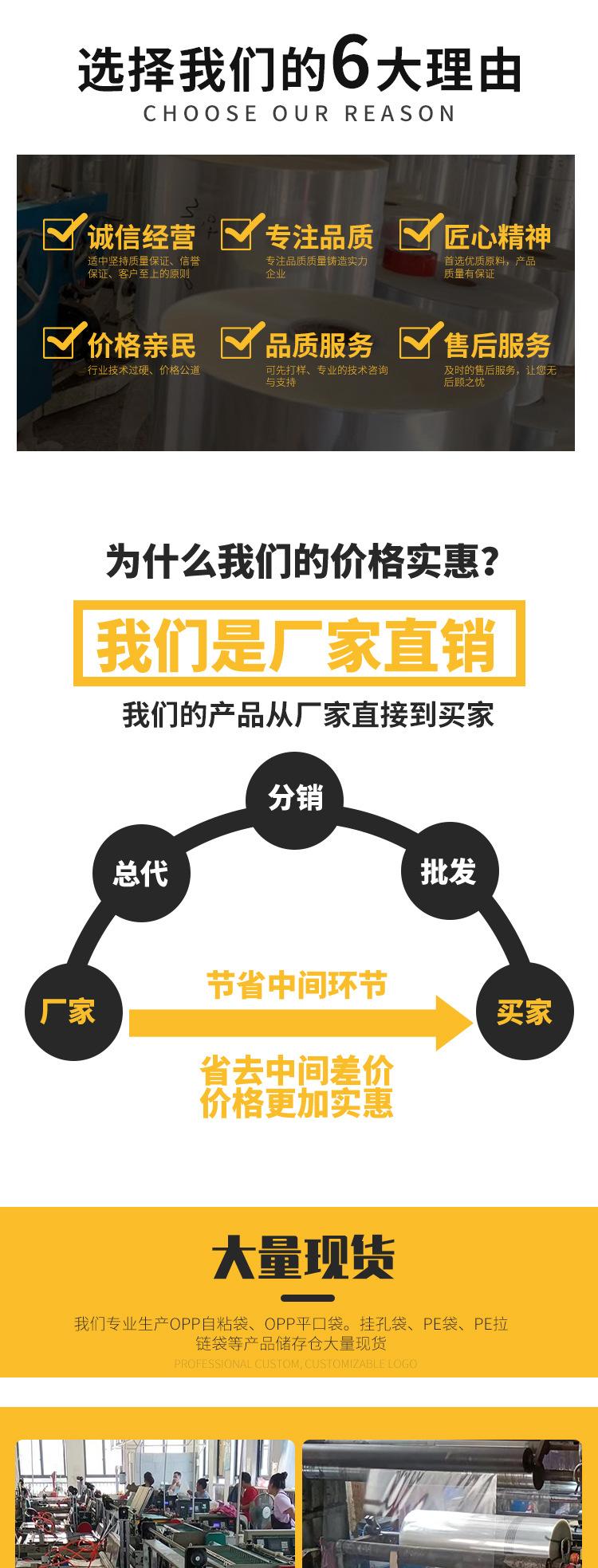 Somos una fábrica especializada en la producción y procesamiento de bolsas de OPP, bolsas transparentes, bolsas impermeables, bolsas autoadhesivas, bolsas de PE autosellantes, bolsas de OPP con cabezal de cartón, bolsas de OPP autosellantes, bolsas de PE autoadhesivas, bolsas de embalaje de PE, bolsas autoadhesivas, bolsas de PE sellables, bolsas de PE con cierre hermético, bolsas de PVC esmerilado con cierre hermético, bolsas de ropa interior con cierre hermético, bolsas de sujetadores con cierre hermético y otros productos. Contamos con un sistema de gestión de calidad completo y científico. La integridad, la solidez y la calidad de nuestros productos en Yiwu Suchuang Bag Manufacturing han sido reconocidas por la industria. Invitamos a amigos de todos los ámbitos a visitarnos, guiarnos y negociar.