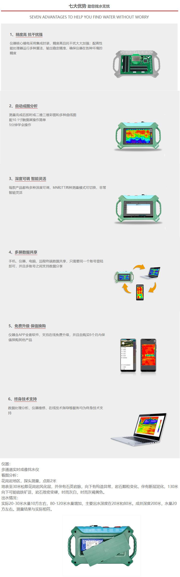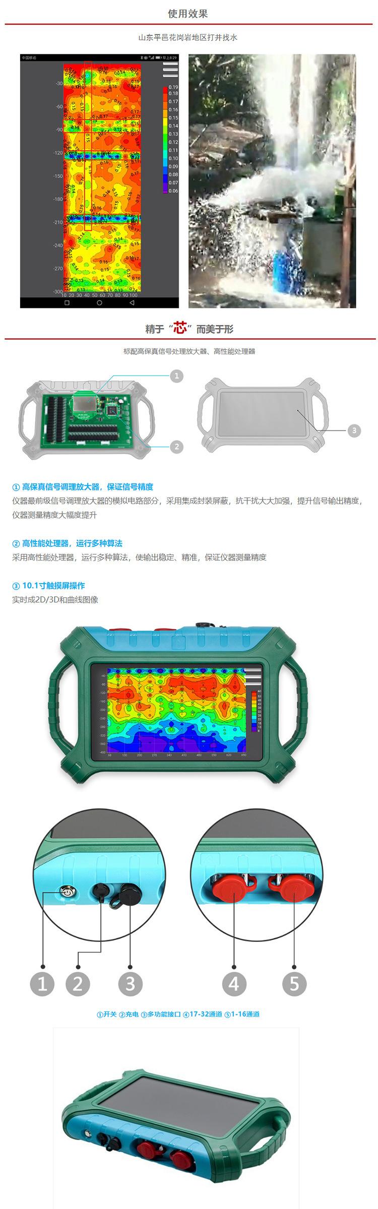 El detector de agua multicanal se utiliza para determinar la ubicación, profundidad, volumen de agua y otra información relacionada del agua subterránea para guiar las operaciones de perforación de pozos y extracción de agua y mejorar la tasa de éxito de la perforación de pozos. Investigación y estudio detallados de la hidrogeología regional.