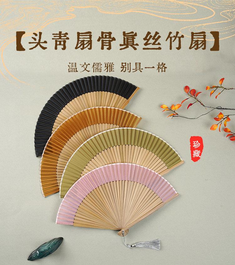 Lugar escénico regalo cabeza abanico verde hueso de abanico seda bambú abanico artesanías de bambú danza abanico plegable para damas abanico femenino antiguo mayoreo